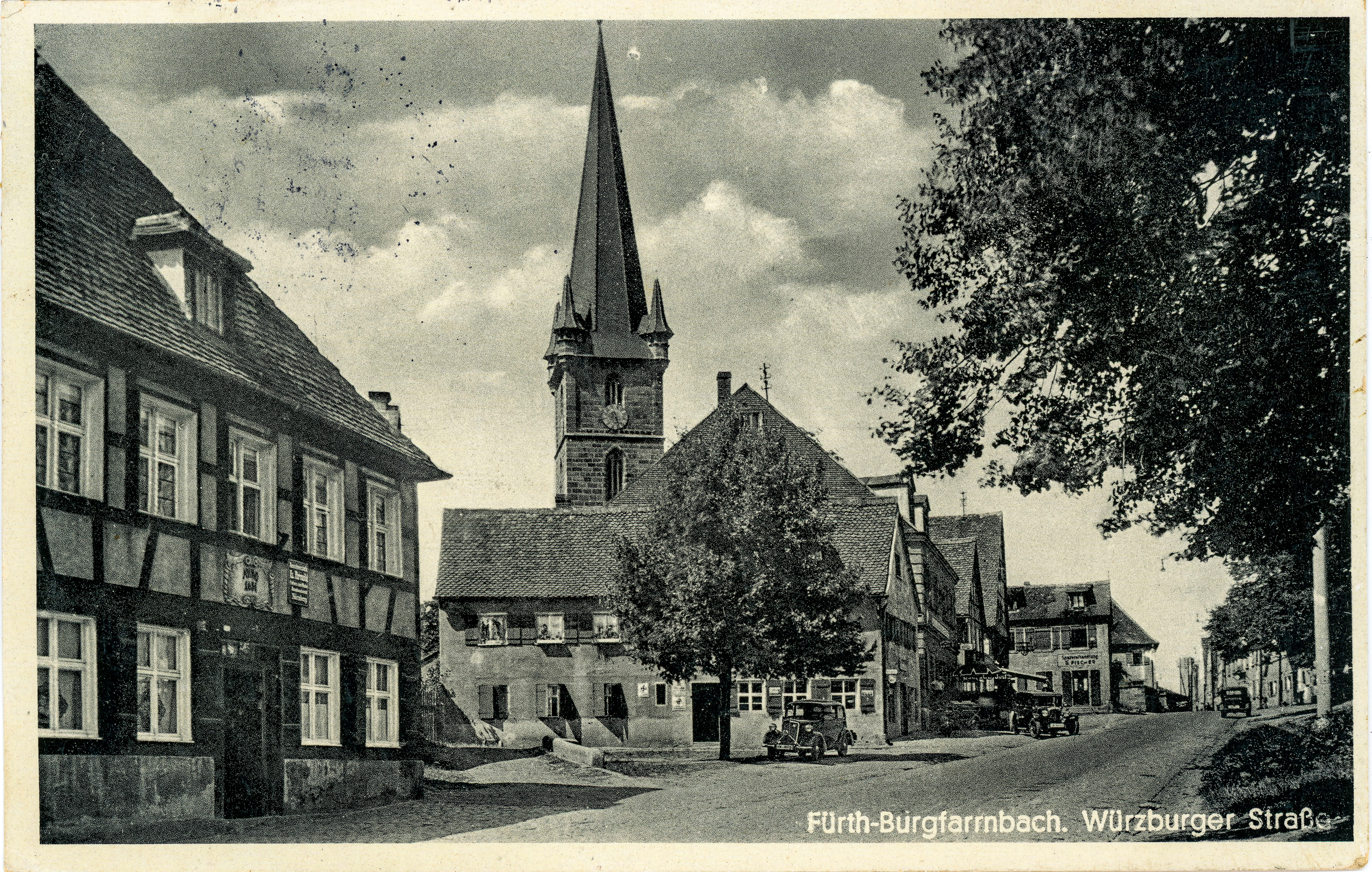 | Beschreibung | Ansichtskarte aus Burgfarrnbach mit Blick auf die Kirche St. Johannis, gel. 1939 | ||