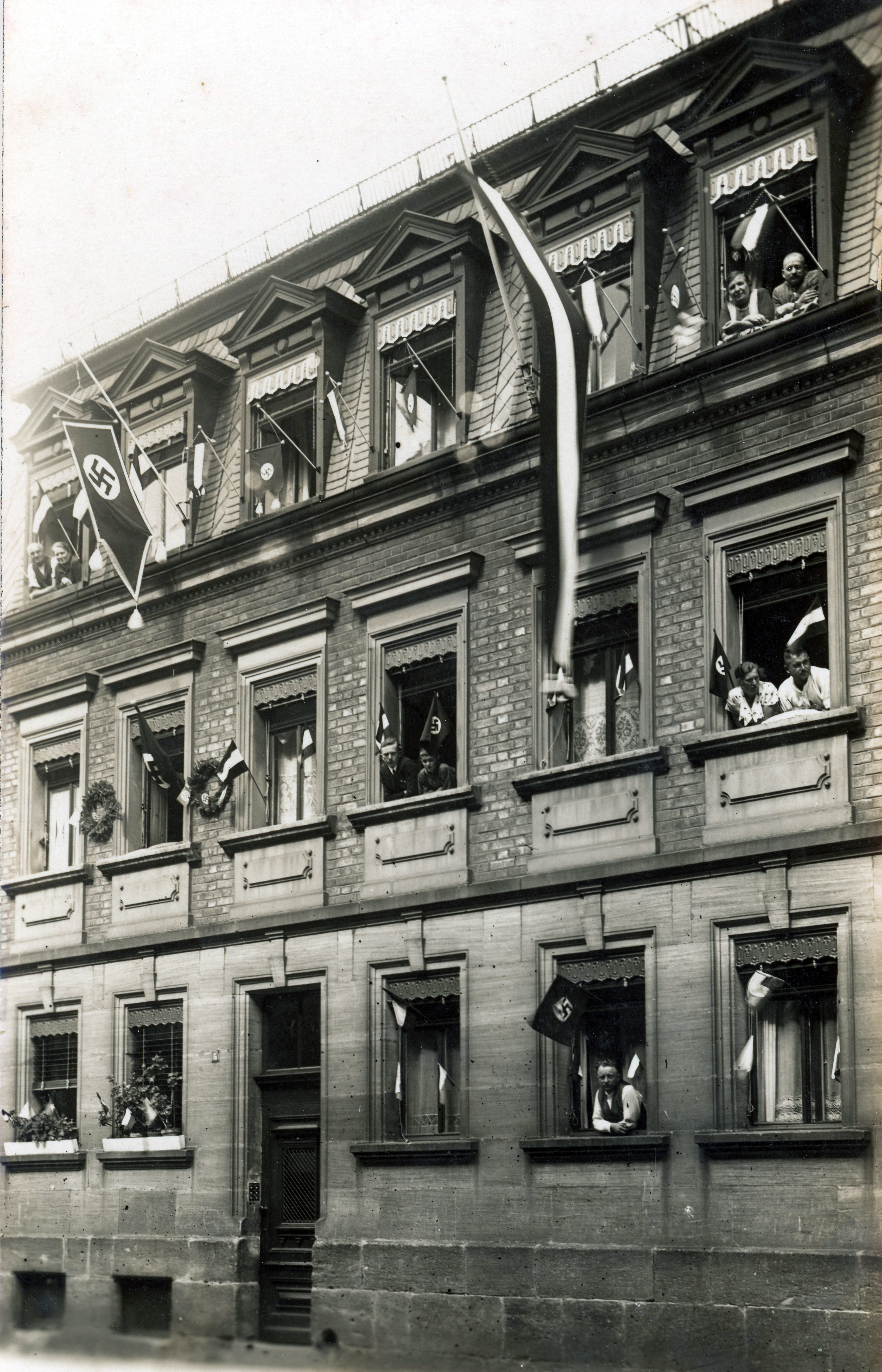 BeschreibungUnbekanntes Haus mit der Hausnummer 5, Fahnenbeflaggung mit Hakenkreuz; ca 1935