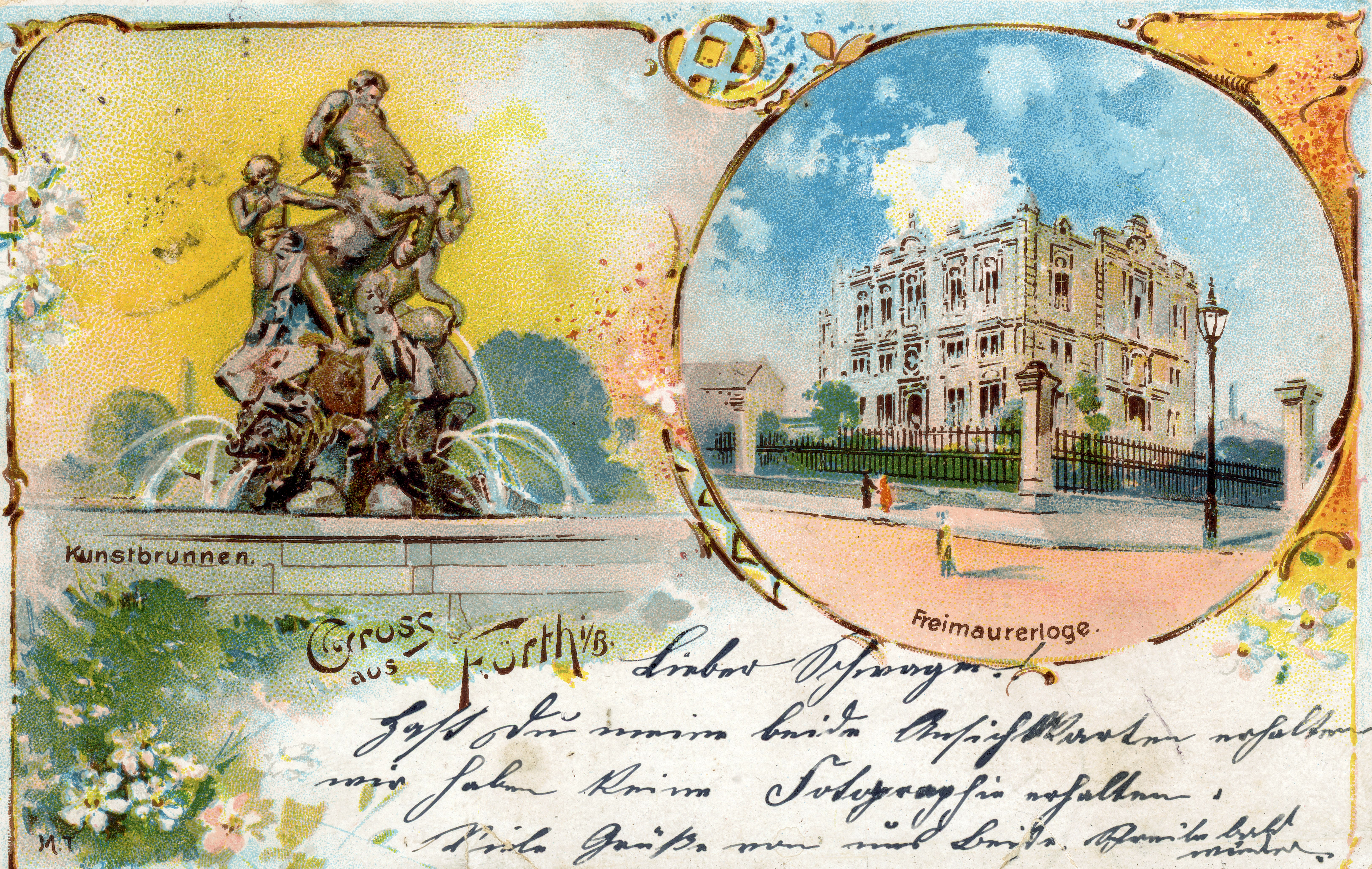 | Dateiinfo (Bild-Unterschrift und Info-Box, automatisch erstellt) | Ansichtskarte mit Logenhaus / Freimaurer und Kunstbrunnen, gel. 1900 Urheber: unbekannt<br>Erstellungsdatum: 1900<br>Lizenz: CC-BY-SA-4.0 | ||