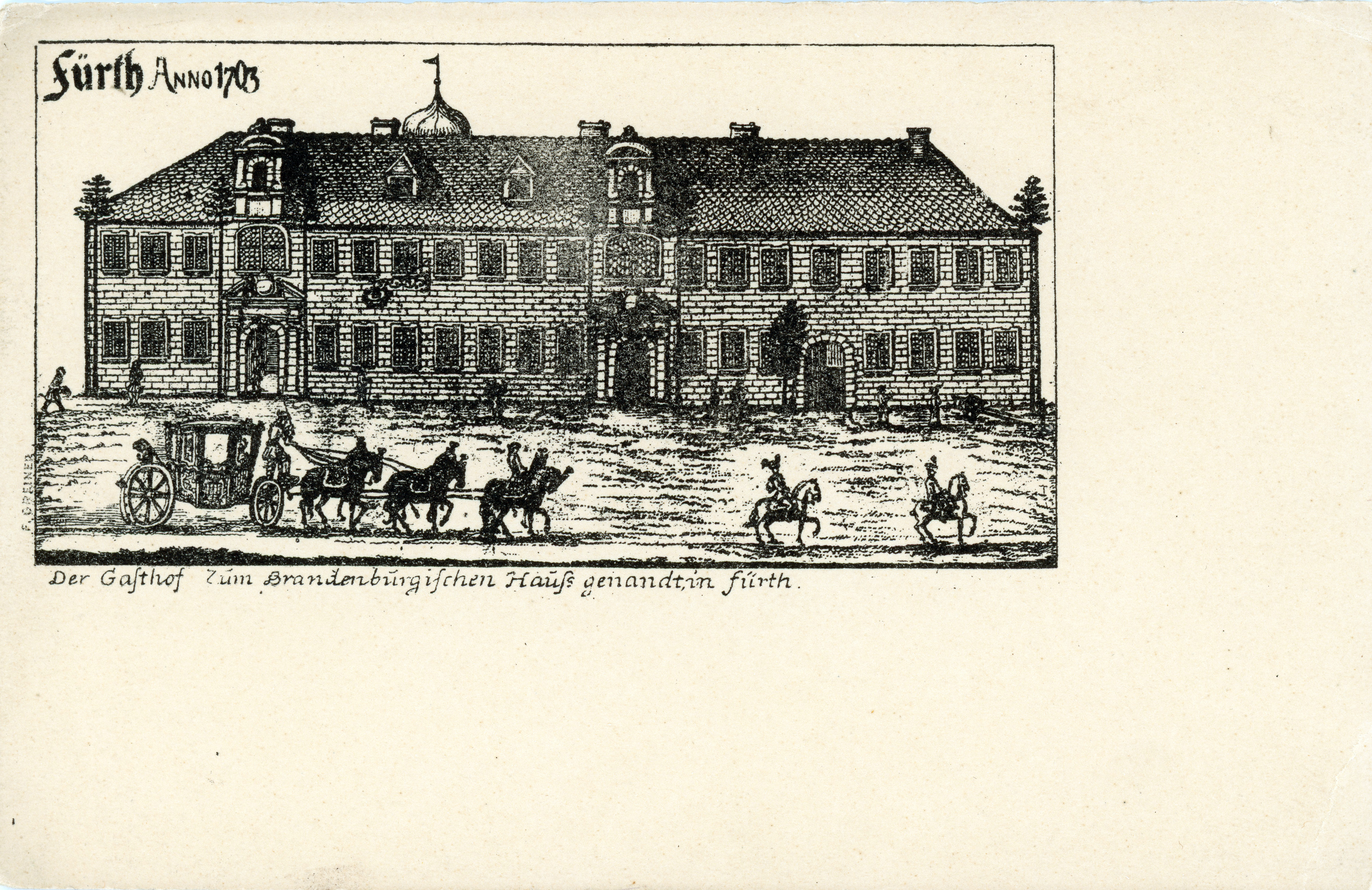 | Beschreibung | Ansichtskarte vom Boenerstich aus dem Jahr 1708: Der Gasthof Zum Brandenburgischen Hauß genannt in Fürth, ca. 1900 | ||