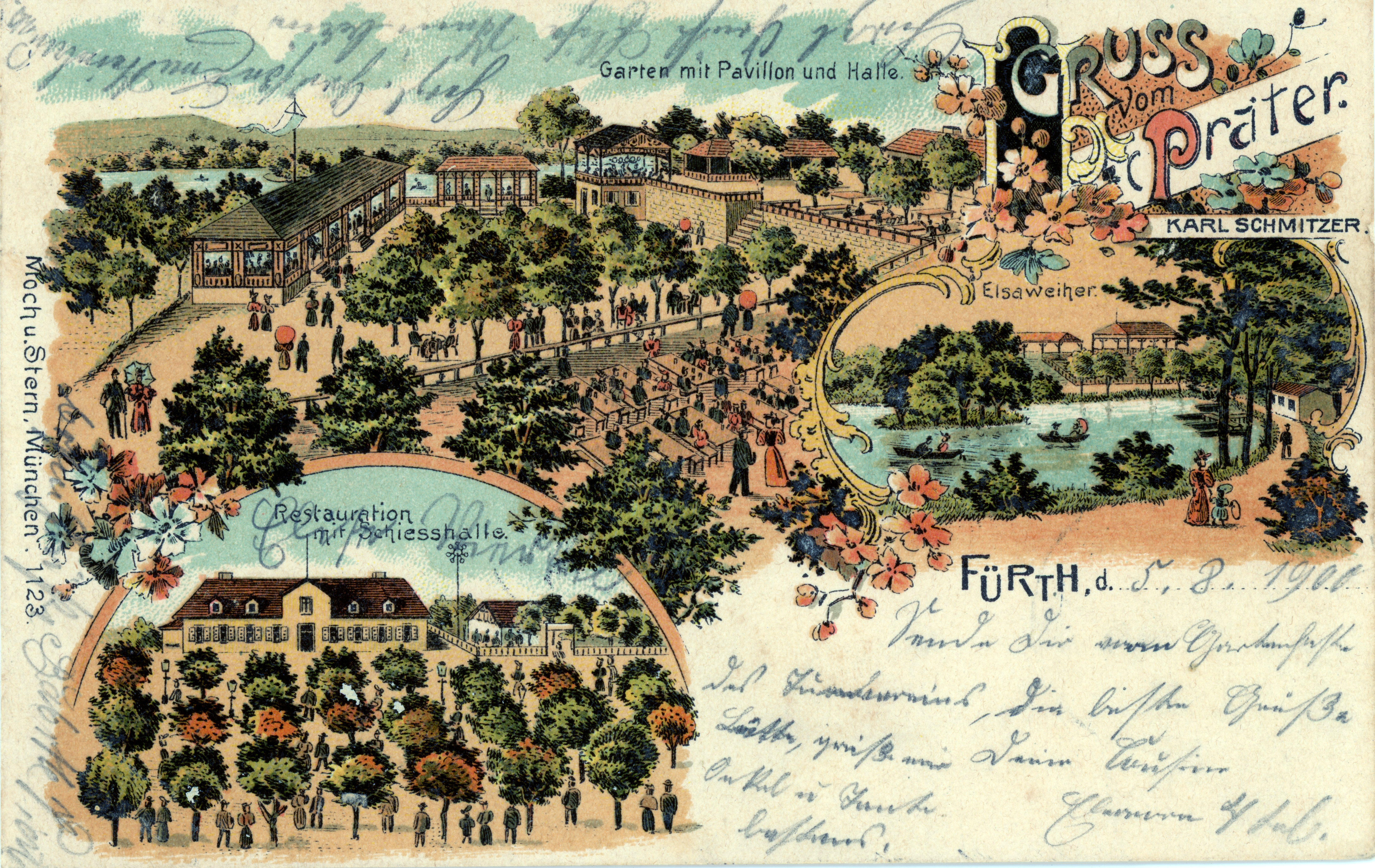 | Beschreibung | Ansichtskarte des ehem. Prater mit Garten und Pavillon samt Halle, sowie Elsaweiher und Restauration mit Schiessanlage, gel. 1900 | ||