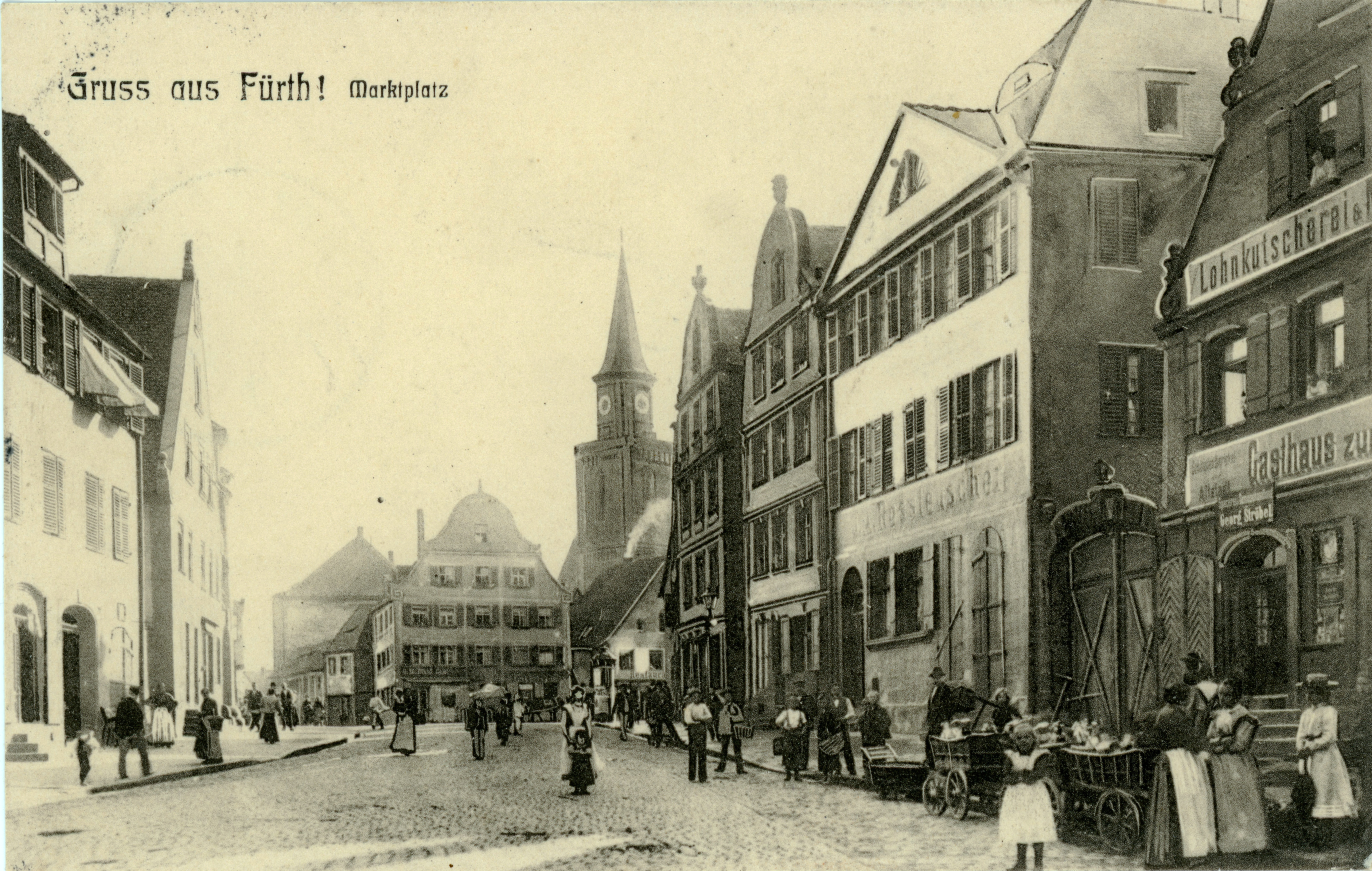 | Dateiinfo (Bild-Unterschrift und Info-Box, automatisch erstellt) | Historische Ansicht des Fürther Marktplatzes (Grüner Markt), gel. 1907 Urheber: Unberkannt<br><br>Lizenz: CC BY-SA 3.0 | ||