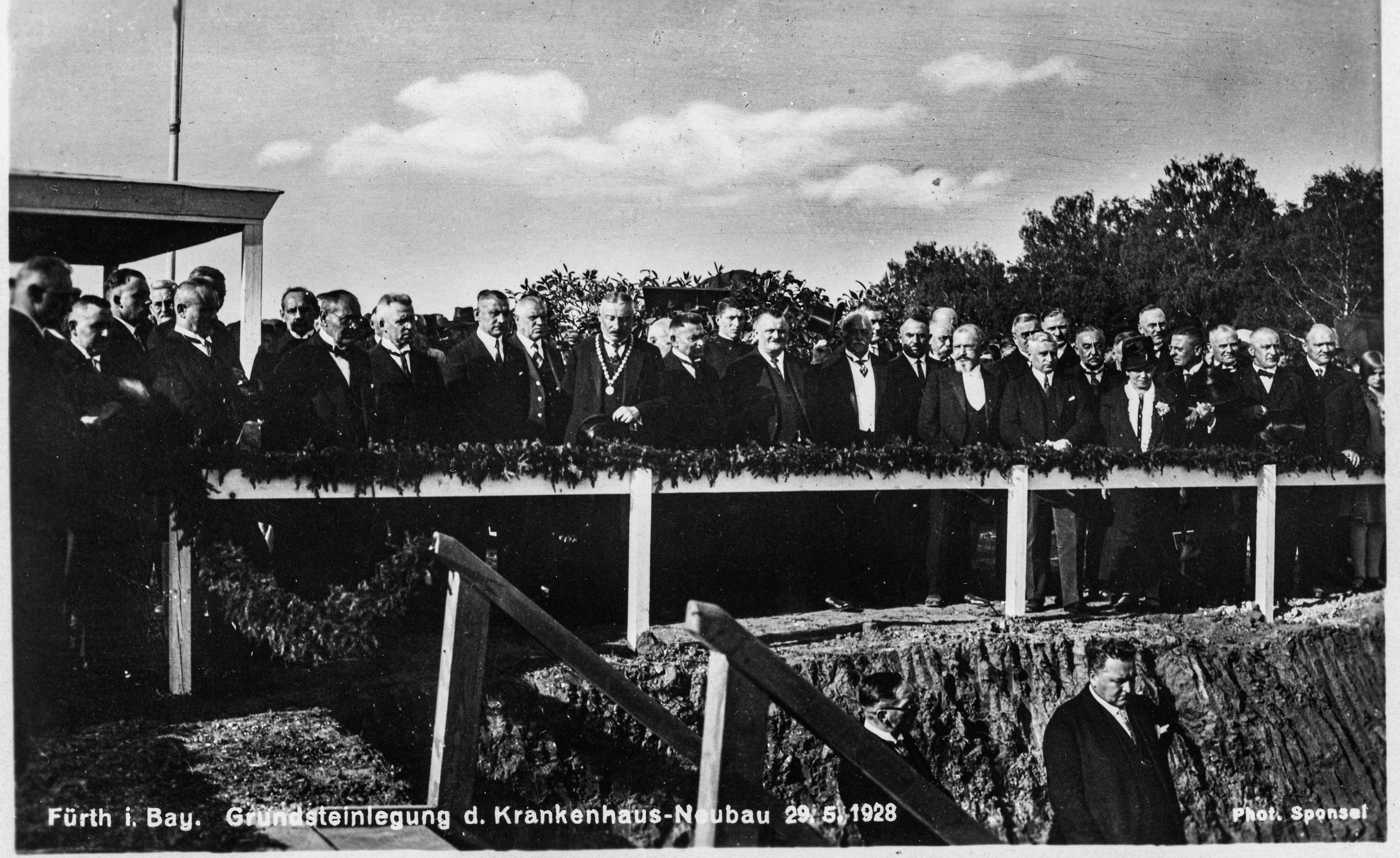 | Beschreibung | Grundsteinlegung des neuen Stadtkrankenhauses auf der Schwand am 29. Mai 1928, Festredner OB Dr. Robert Wild - hier im Publikum, in der Baugrube Stadtbaurat Hermann Herrenberger | ||