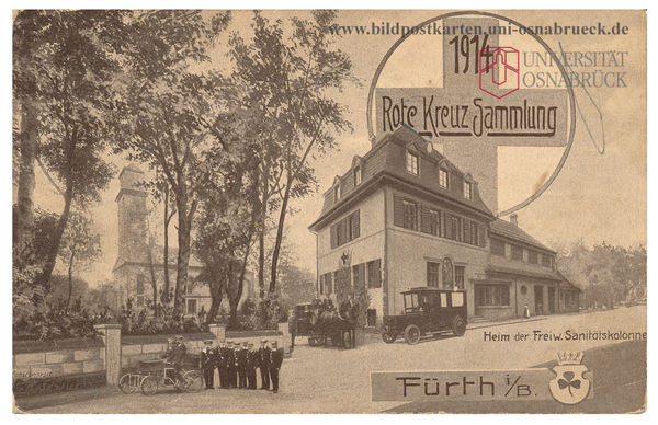 | Beschreibung | Rote Kreuz Sammlung 1914, Fürth i.B. Heim der Freiw. Sanitätskolonne, ungel. | ||