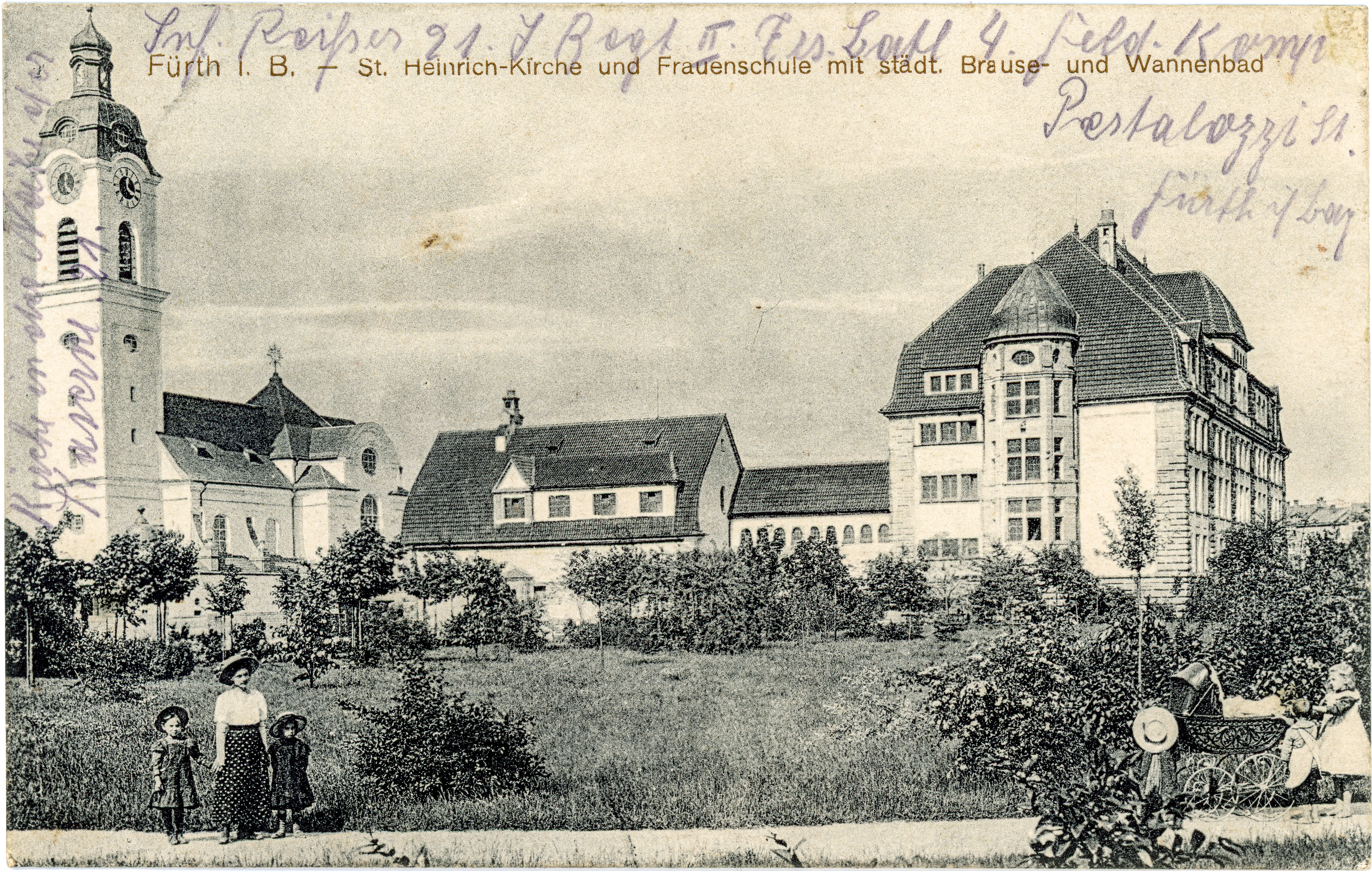| Beschreibung | Historische Ansichtskarte "St. Heinrichs-Kirche und Frauenschule mit städt. Brause- und Wannenbad", Feldpost, gel. 1914 | ||