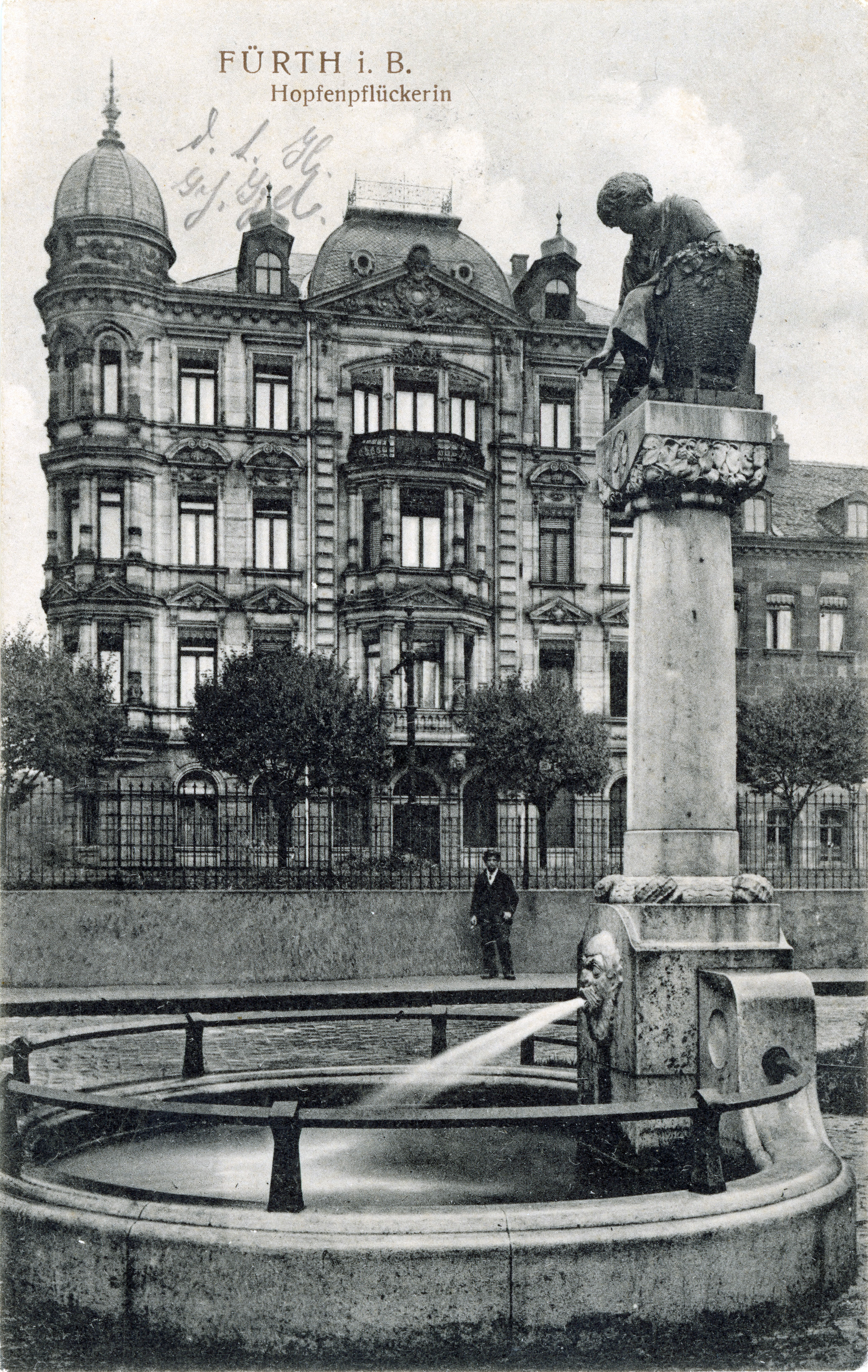 | Beschreibung | Der Hopfenpflückerinbrunnen an der Gabelsbergerstraße, im Hintergrund das noch erhaltene Gebäude Rudolf-Breitscheid-Straße 35, gel. 1911 | ||