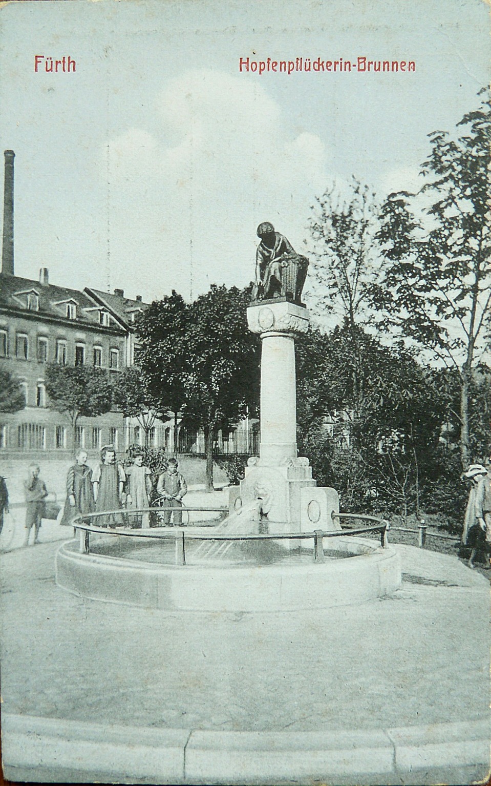 | Beschreibung | Hopfenpflückerinbrunnen auf einer historischen Ansichtskarte | ||