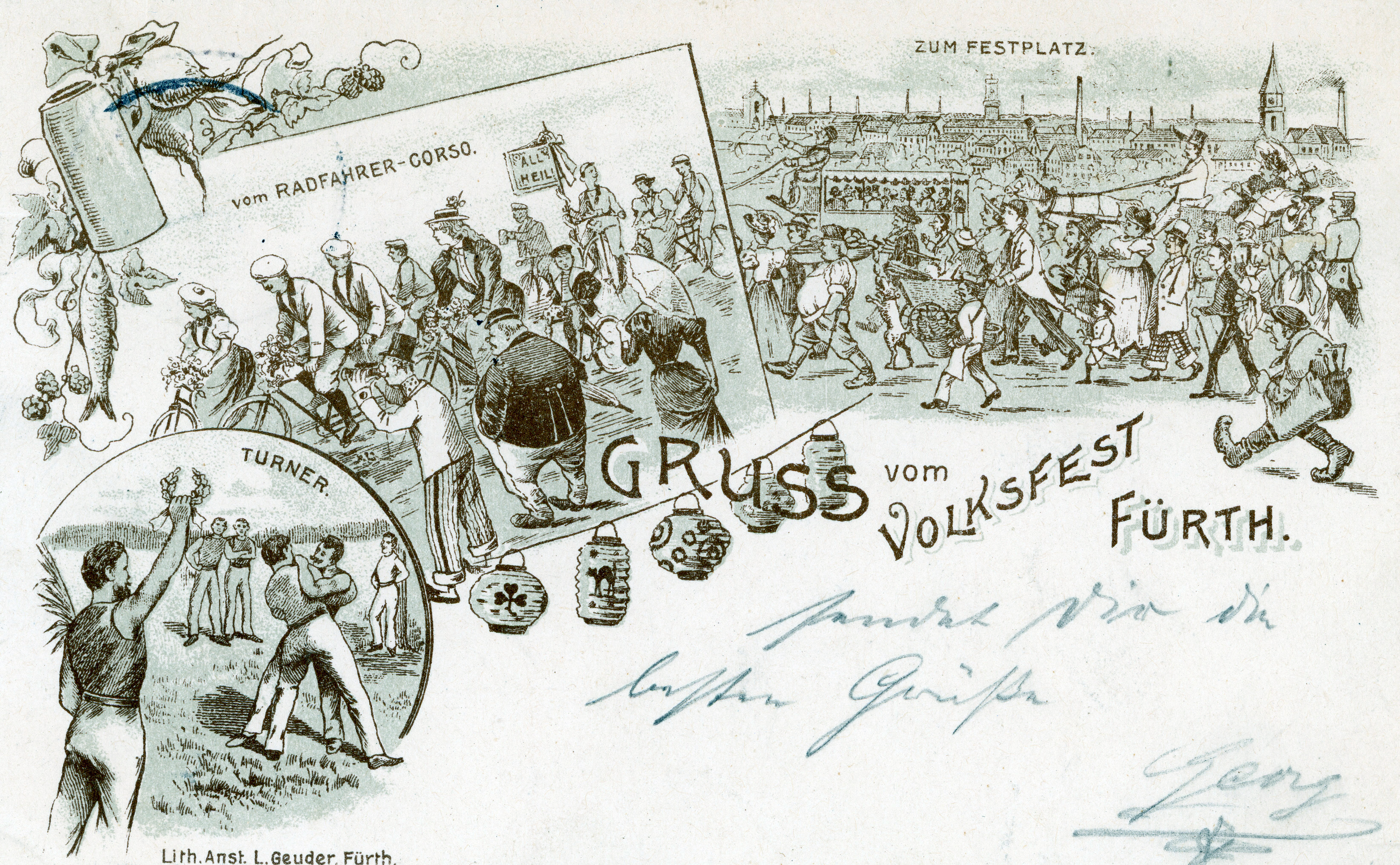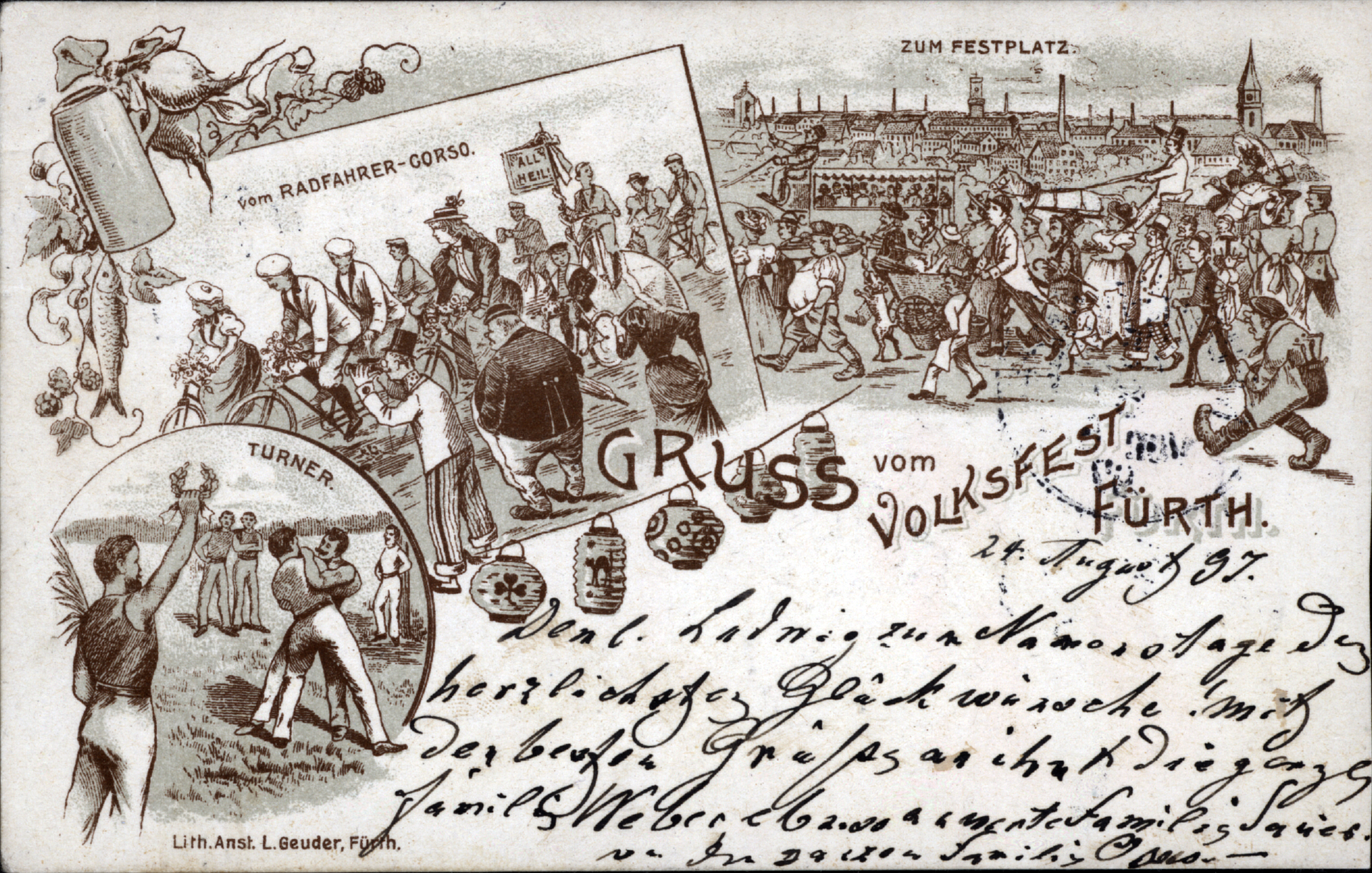 Historische Ansichtskarte vom Sedans-Volksfest auf der Hard samt Fahrradkorso mit dem Ausspruch All ... Historische Ansichtskarte vom Sedans-Volksfest auf der Hard samt Fahrradkorso mit dem Ausspruch All Heil! , gel. 1897<br>Urheber: Lith. Anst. L. Geuder, Fürth<br>Erstellungsdatum: 24. August 1897<br>Lizenz: cc-by-sa-3.0