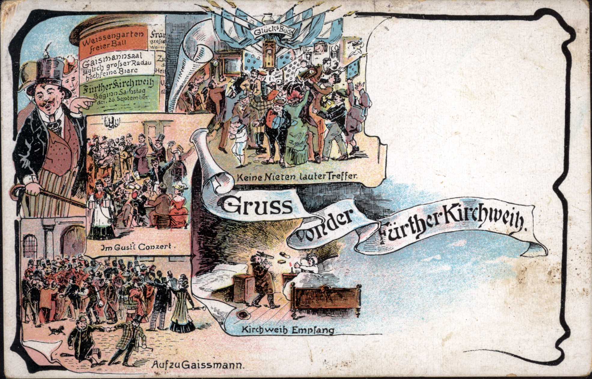 | Beschreibung | Gruß von der Fürther Kirchweih, historische Ansichtskarte, um 1900 | ||