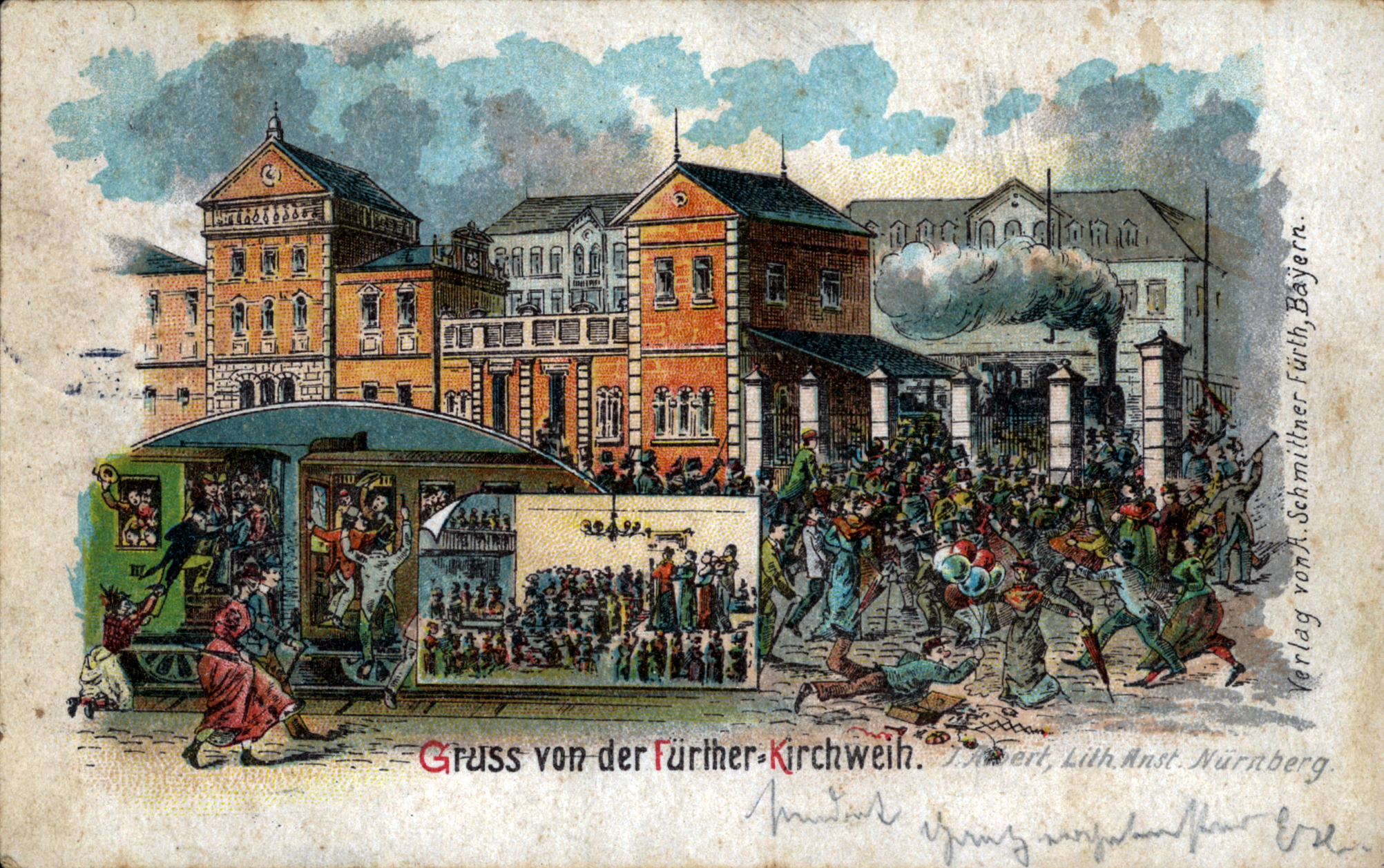 | Beschreibung | Gruß von der Fürther Kirchweih, historische Ansichtskarte gezeichnet mit dem ehem. Ludwigsbahnhof, um 1900 | ||
