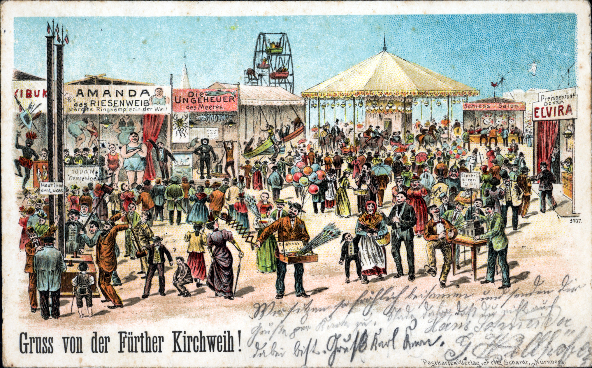 | Beschreibung | Gruß von der Fürther Kirchweih, historische Ansichtskarte, um 1905 | ||