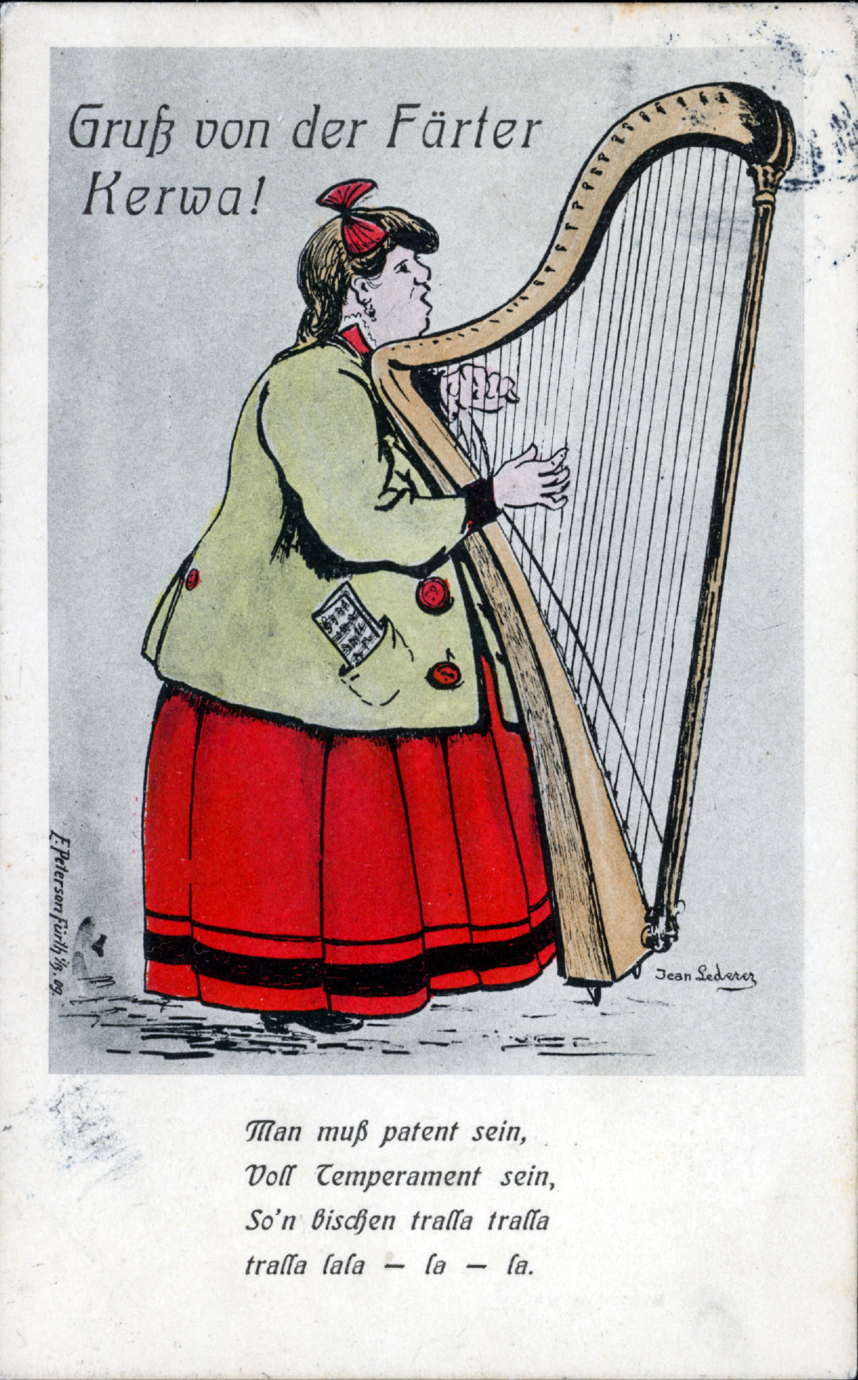 | Beschreibung | Gruß von der Fürther Kirchweih, historische Ansichtskarte gezeichnet vom Fürther Maler Jean Lederer mit einer Harfe spielenden Frau, um 1909 | ||