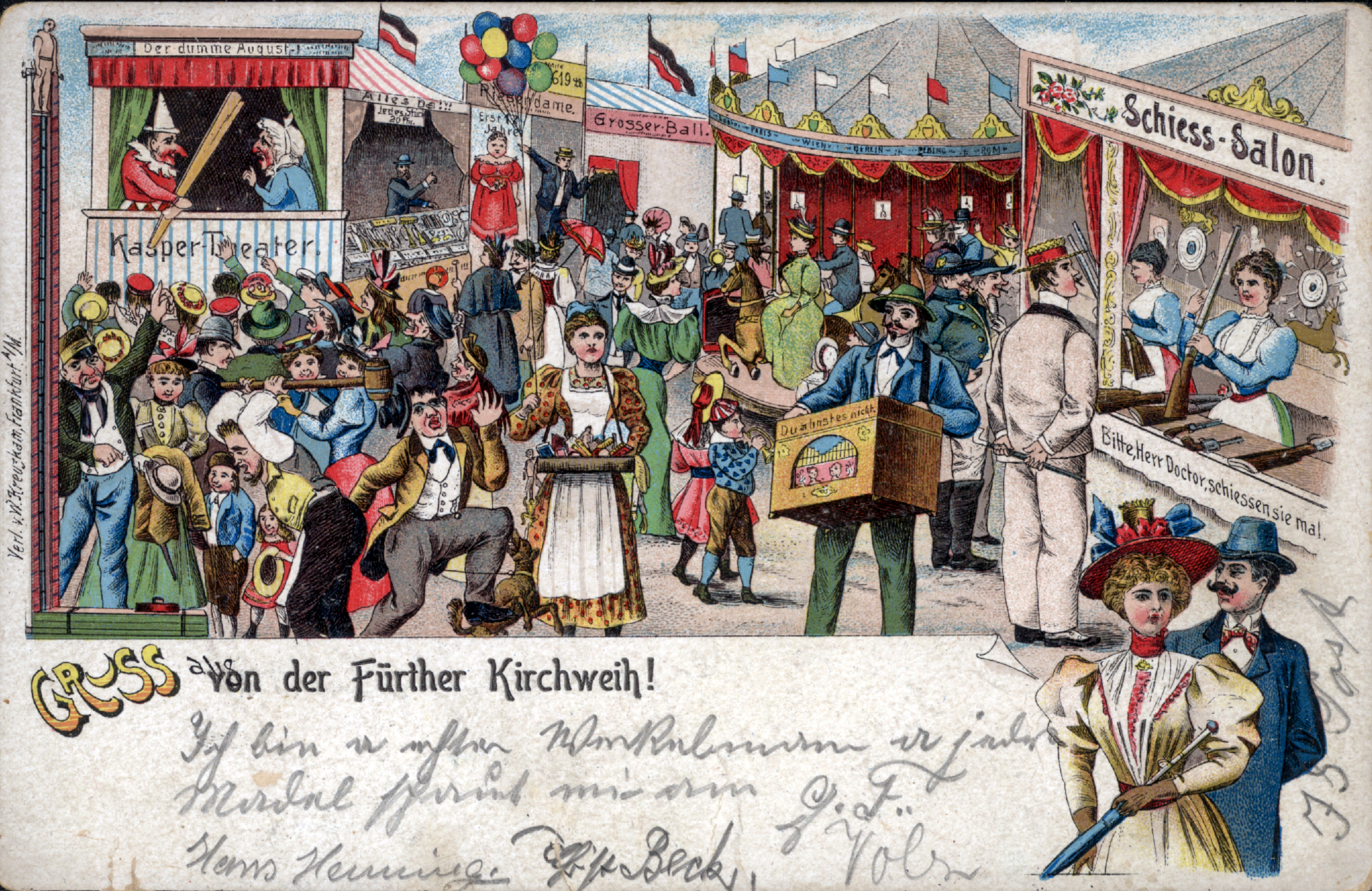 | Beschreibung | Gruß von der Fürther Kirchweih, historische Ansichtskarte gezeichnet von einem unbekannten Maler, um 1900 | ||
