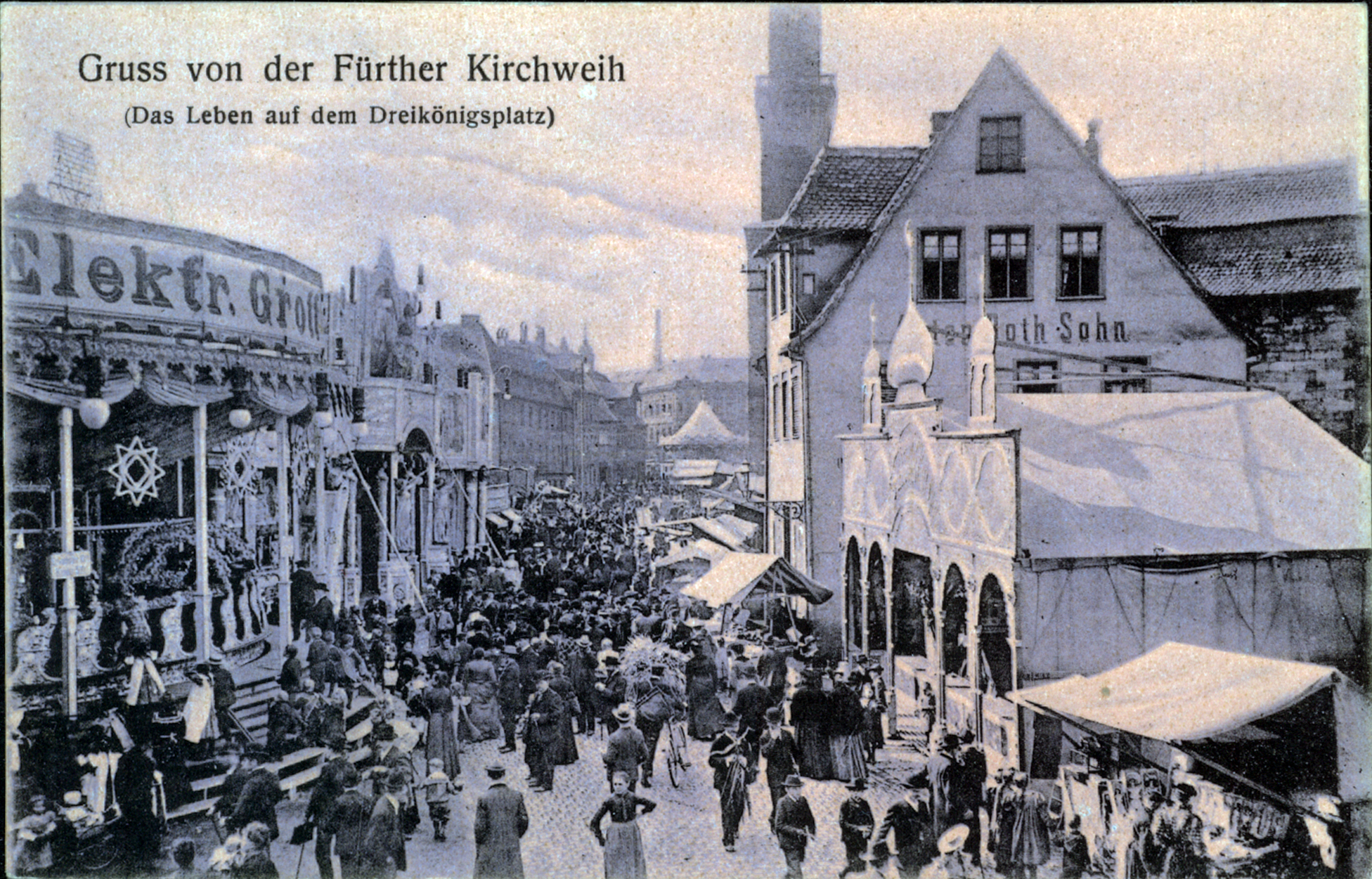 | Beschreibung | Gruß von der Fürther Kirchweih, historische Ansichtskarte mit Blick vom Königsplatz in die Brandenburger Straße, um 1920 | ||