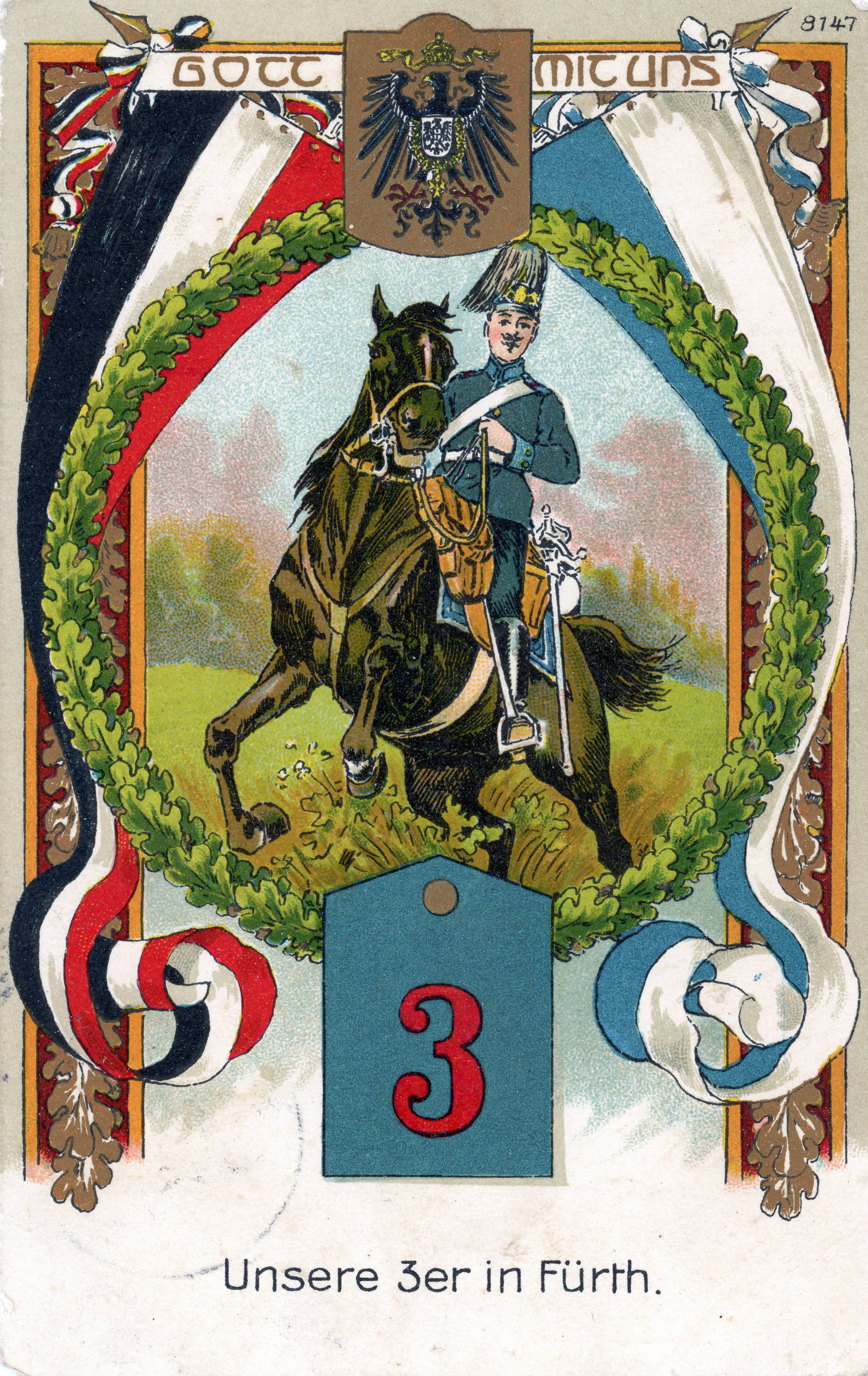 | Beschreibung | Ansichtskarte der Königlich Bayerische 3. Train-Abteilung, gel. Mrz 1915 | ||