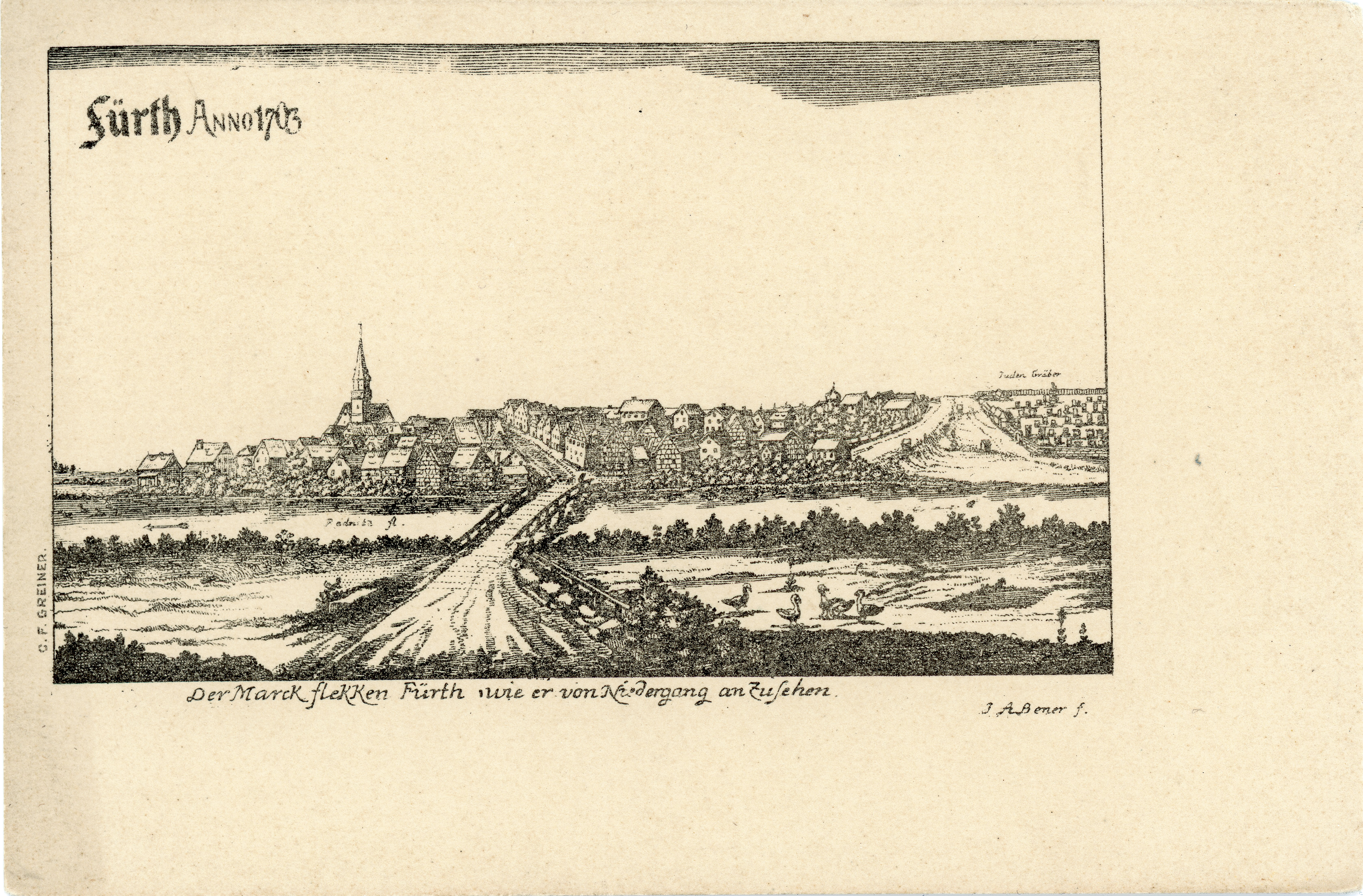| Beschreibung | Ansichtskarte vom Boenerstich aus dem Jahr 1708: Der Marktflekken Fürth wie er von Niedergang an Zuzusehen, ca. 1900 | ||
