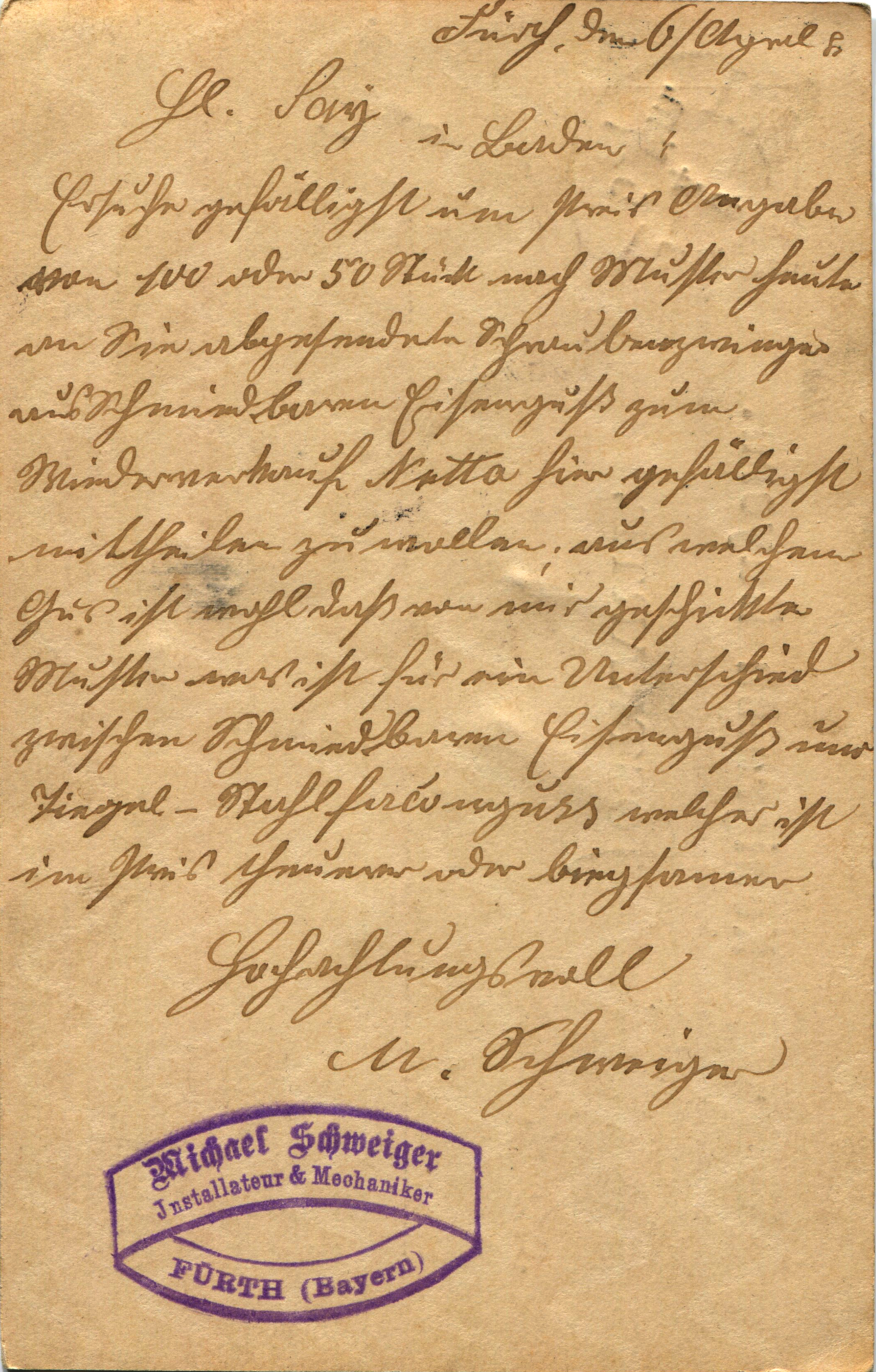| Beschreibung | Ansichtskarte von Michael Schweiger, Installateur & Mechaniker – gel. 1897 | ||