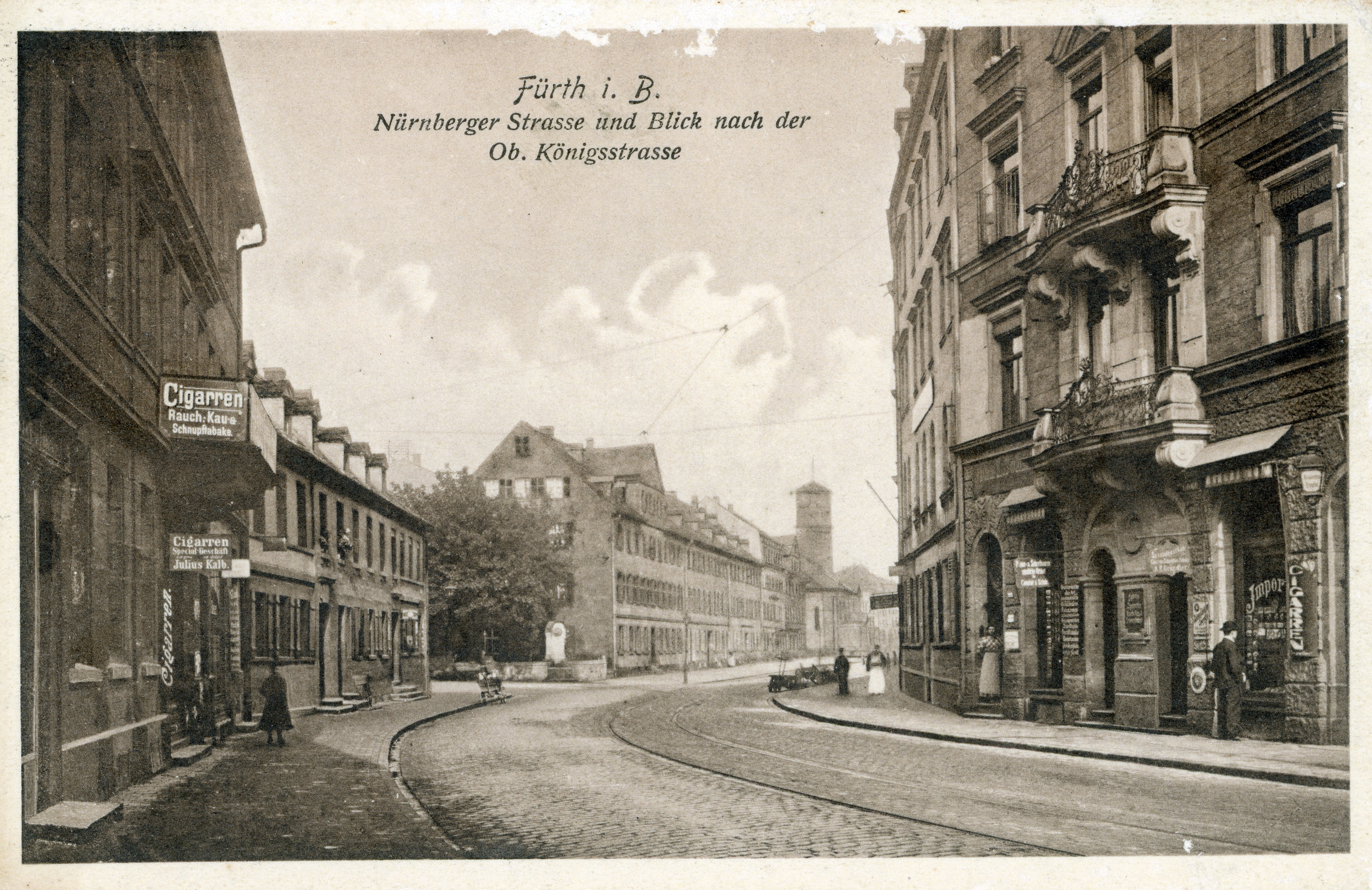 BeschreibungBlick in die Nürnberger Straße, rechts das Hotel Kronprinz, im Hintergrund der König-Ludwig-Brunnen und die Wohnhäuser Königstraße 138 / 140, ngl. 1910