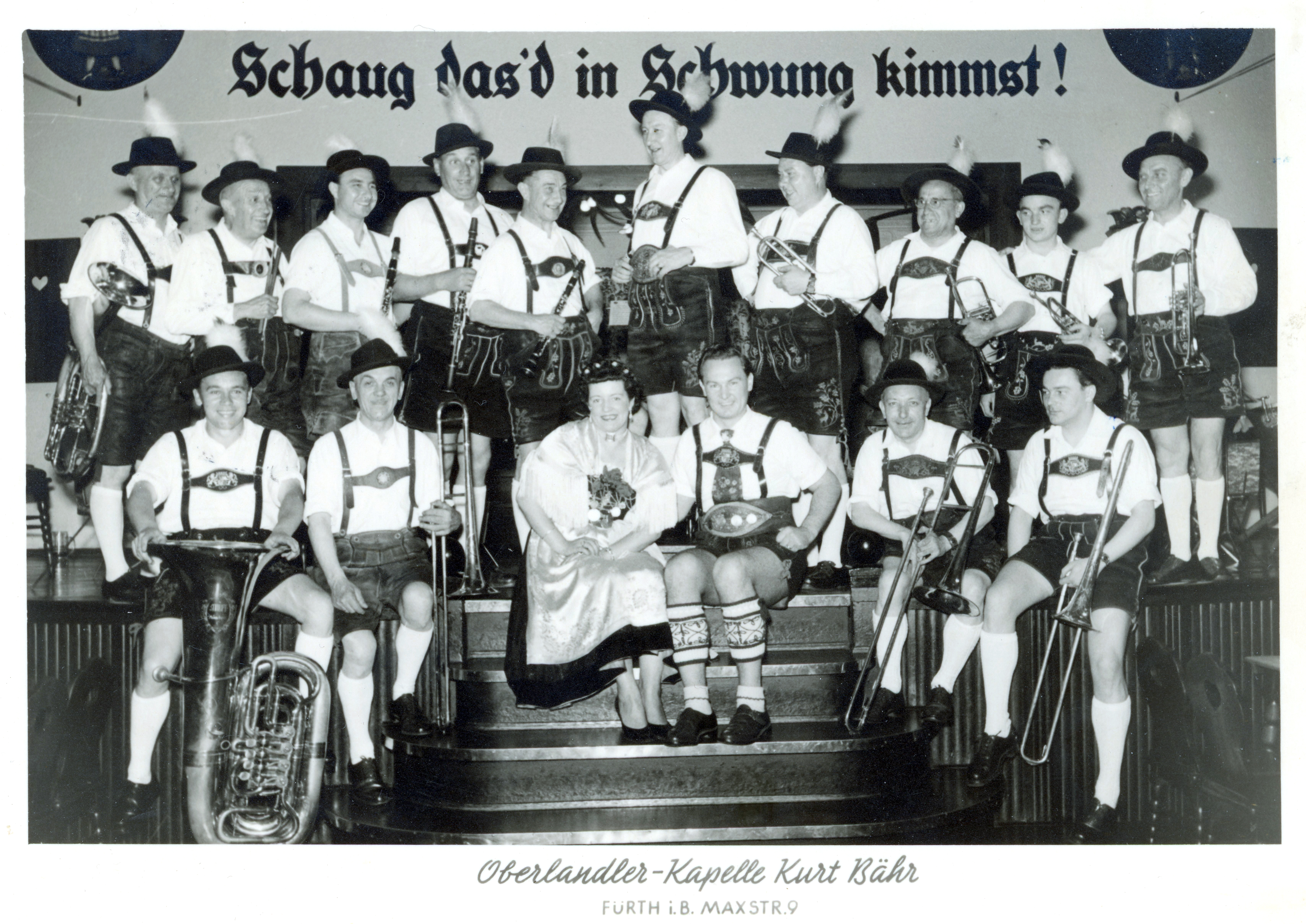 | Dateiinfo (Bild-Unterschrift und Info-Box, automatisch erstellt) | Oberlandler-Kapelle von Kurt Bähr in den 1950er Jahren, gel. 1959 Urheber: unbekannt<br>Erstellungsdatum: 10. August 1959<br>Lizenz: cc-by-sa-4.0 | ||