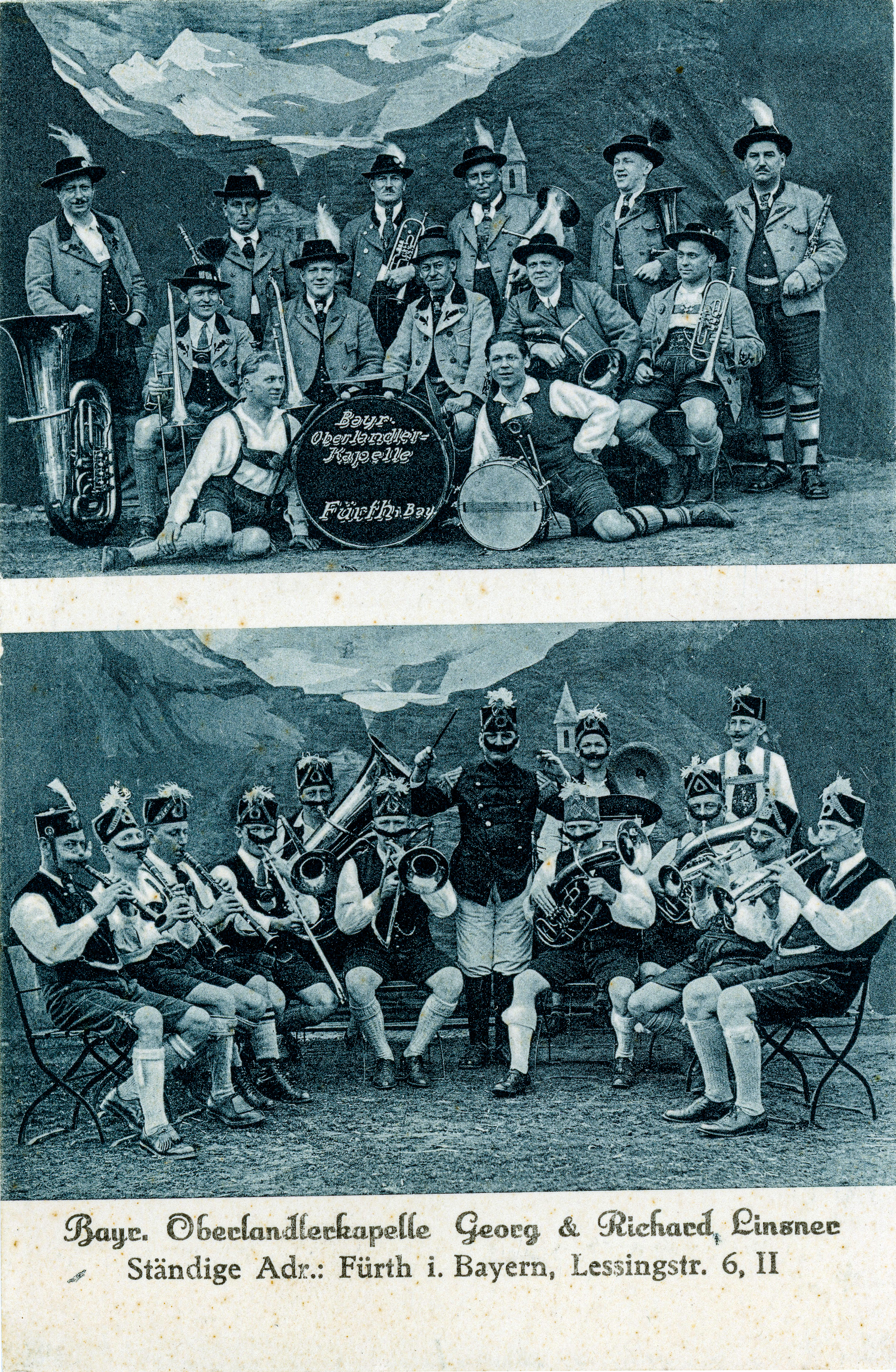 | Beschreibung | Ansichtskarte der Oberlandlerkapelle Georg & Richard Linsner in der Lessingstraße 6, ca. 1920 | ||