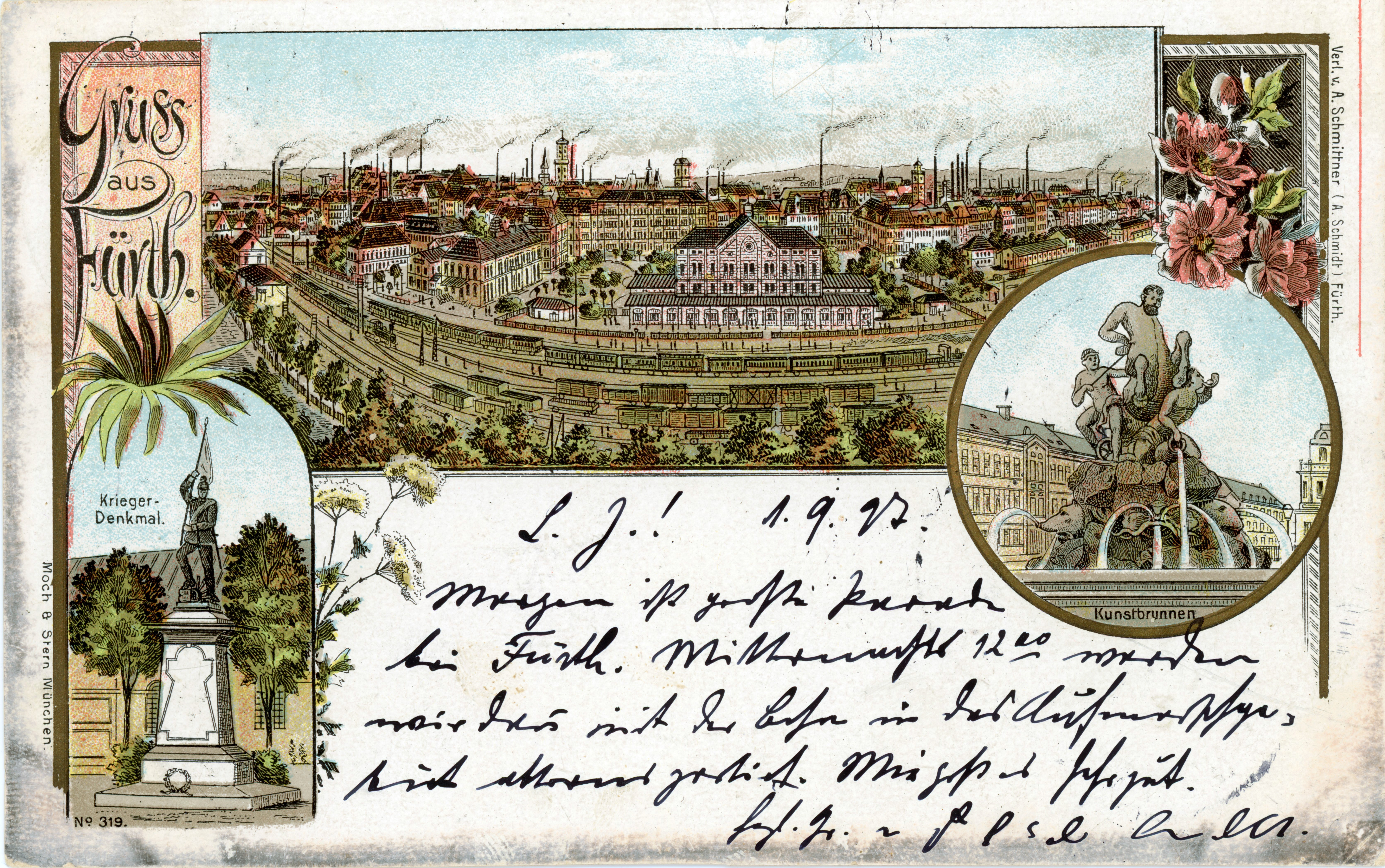 | Beschreibung | Blick über die Stadt Fürth - im Vordergrund der Hauptbahnhof - im Hintergrund die Stadt der 1000 Schlöte, gel. 1897 | ||