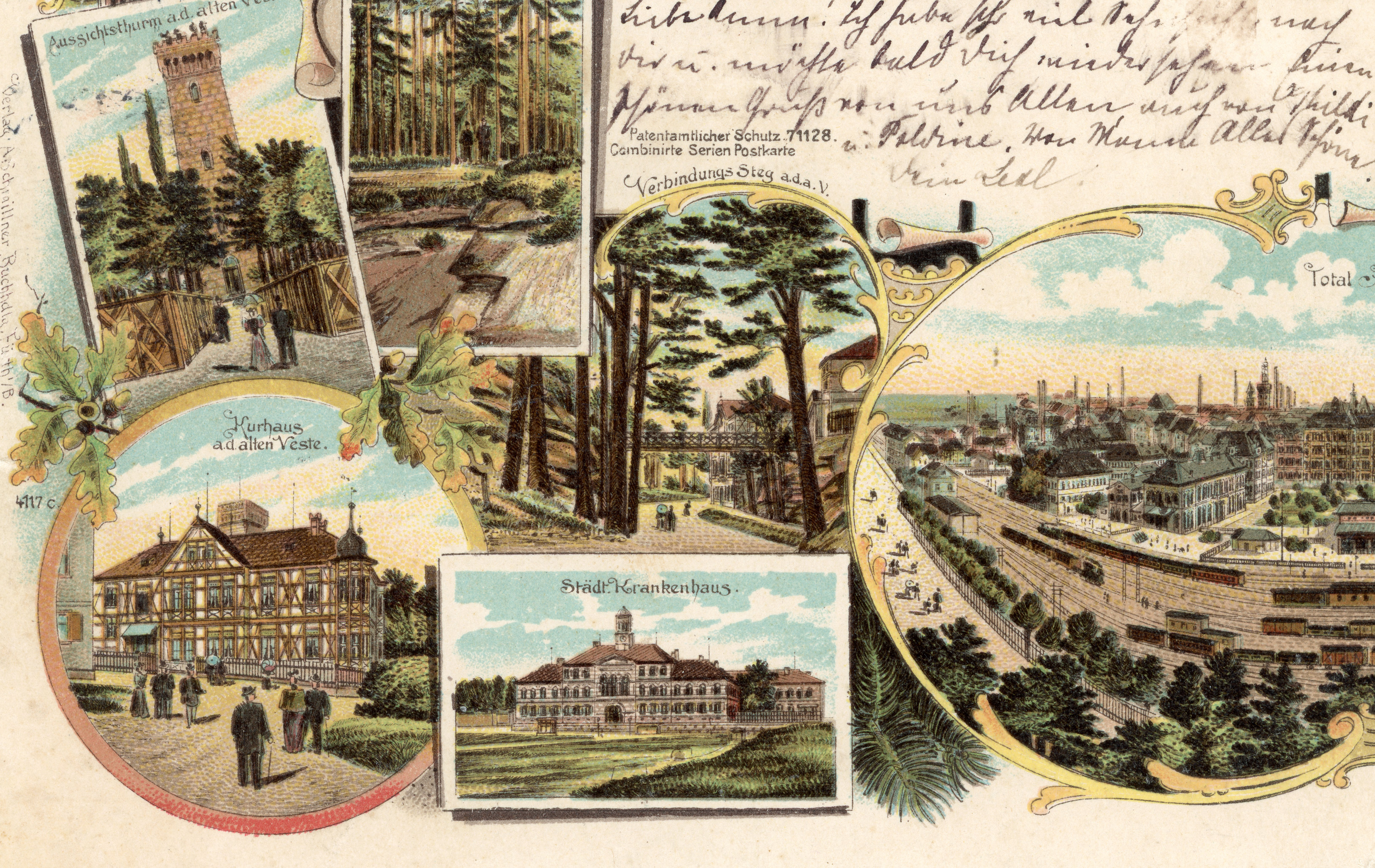| Beschreibung | Ansichtskarte mit verschiedenen Motiven u.a. aus dem Stadtwald, dem ehem. städtischen Klinikum und dem Hauptbahnhof, gel. Mrz 1900 | ||