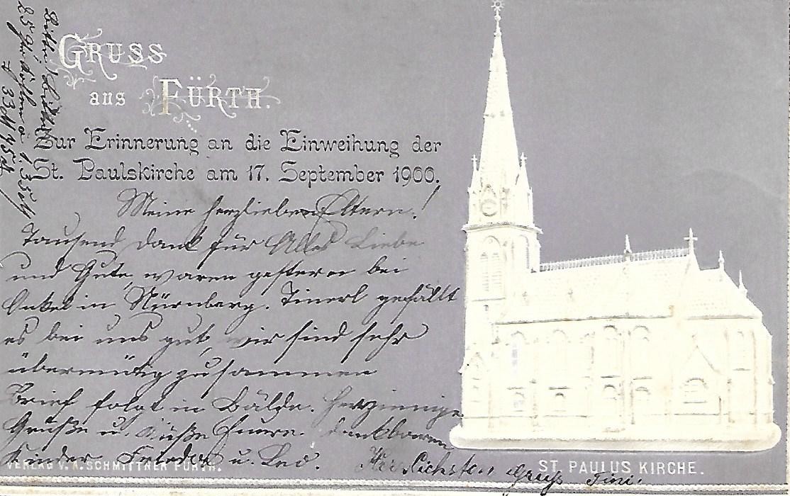 | Dateiinfo (Bild-Unterschrift und Info-Box, automatisch erstellt) | Historische Ansichtskarte "Zur Erinnerung an die Einweihung der St. Paulskirche am 17. September ... Historische Ansichtskarte "Zur Erinnerung an die Einweihung der St. Paulskirche am 17. September 1900.", gel. Sept. 1900<br>Urheber: Verlag A. Schmittner Fürth<br>Erstellungsdatum: 1900<br>Lizenz: cc-by-sa-3.0 | ||