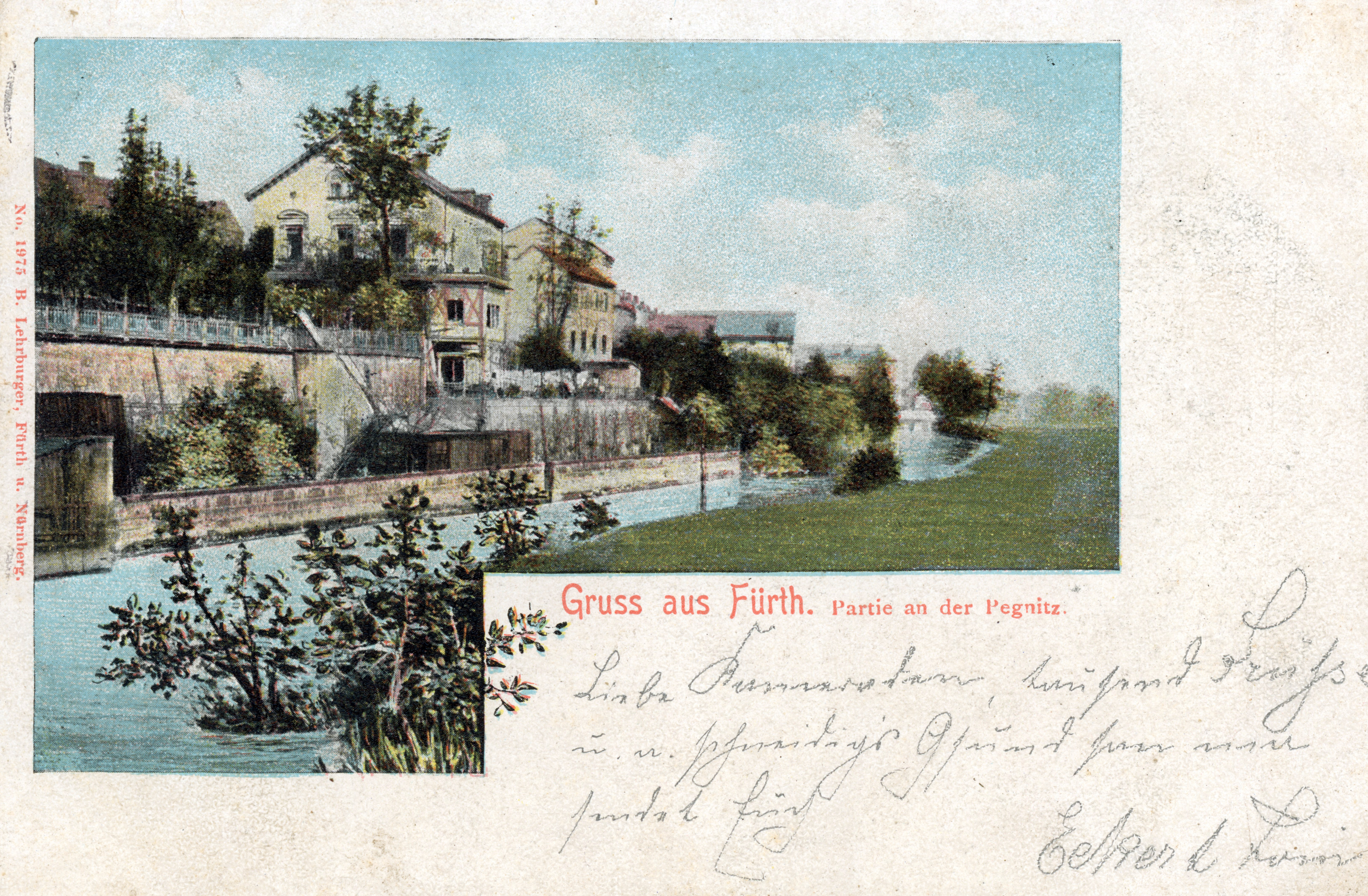| Beschreibung | Alte Ansichtskarte mit Blick auf das Gebäude Königstraße 139 vom Wiesengrund aus - im Vordergrund die Pegnitz im alten Flussbett, gel. 1898 | ||