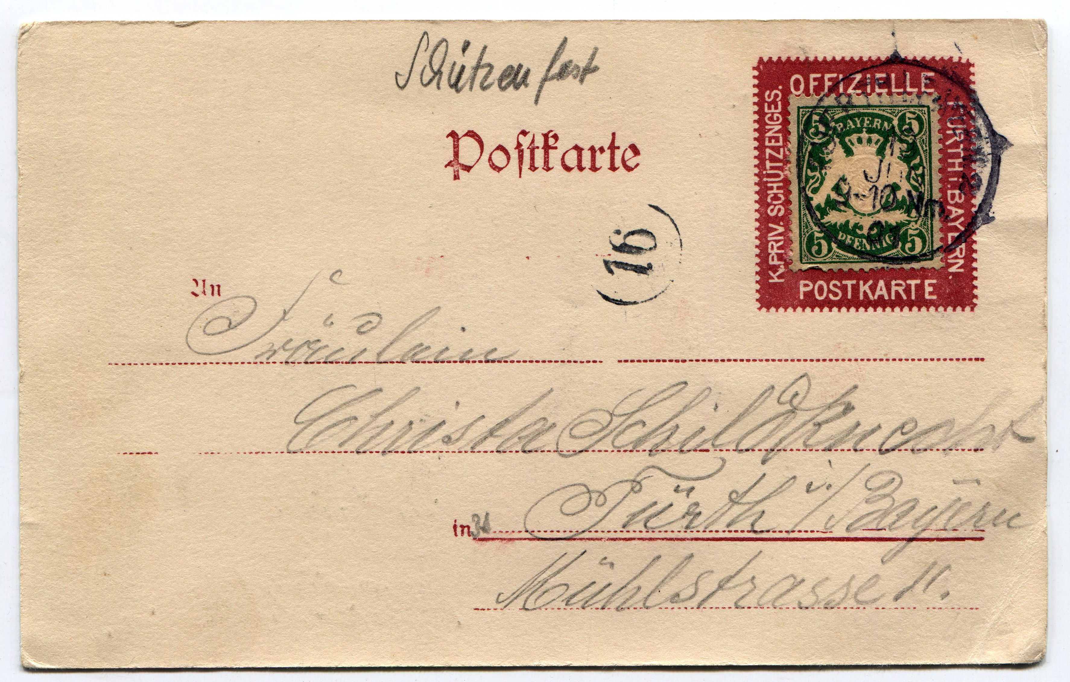 | Beschreibung | Rückseite Ansichtskarte der königlich privilegierten Schützengesellschaft Fürth, anlässlich des 125-jährigen Fest-Vogel-Schießens vom 16. bis zum 19. Juni 1901 an Christa Schildknecht vom Fotoatelier Schildknecht in der Mühlstraße 11 | ||