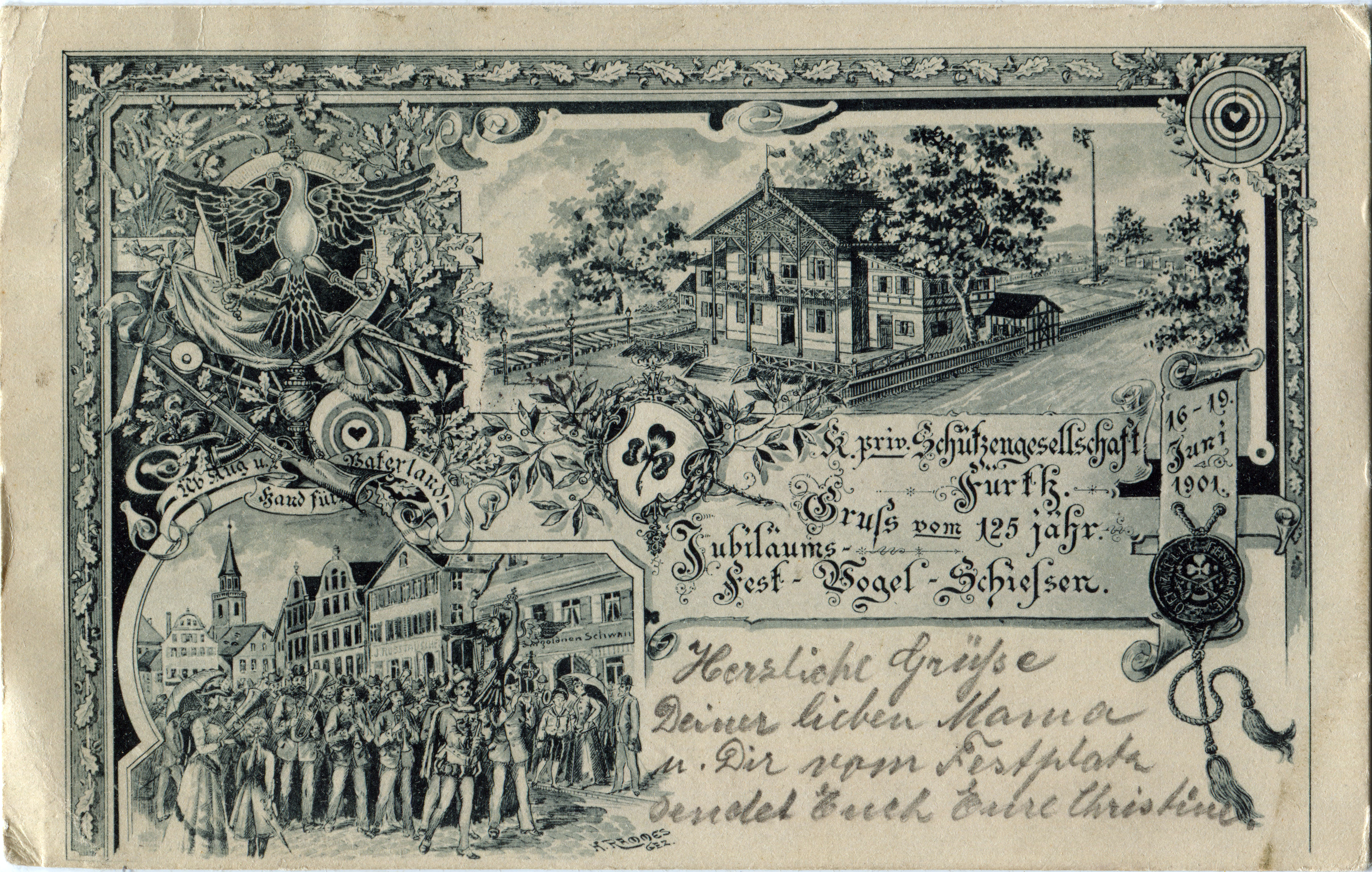 | Beschreibung | Ansichtskarte der Königlich privilegierten Schützengesellschaft Fürth, anläßlich des 125-jährigen Fest-Vogel-Schießen vom 16. bis zum 19. Juni 1901 | ||