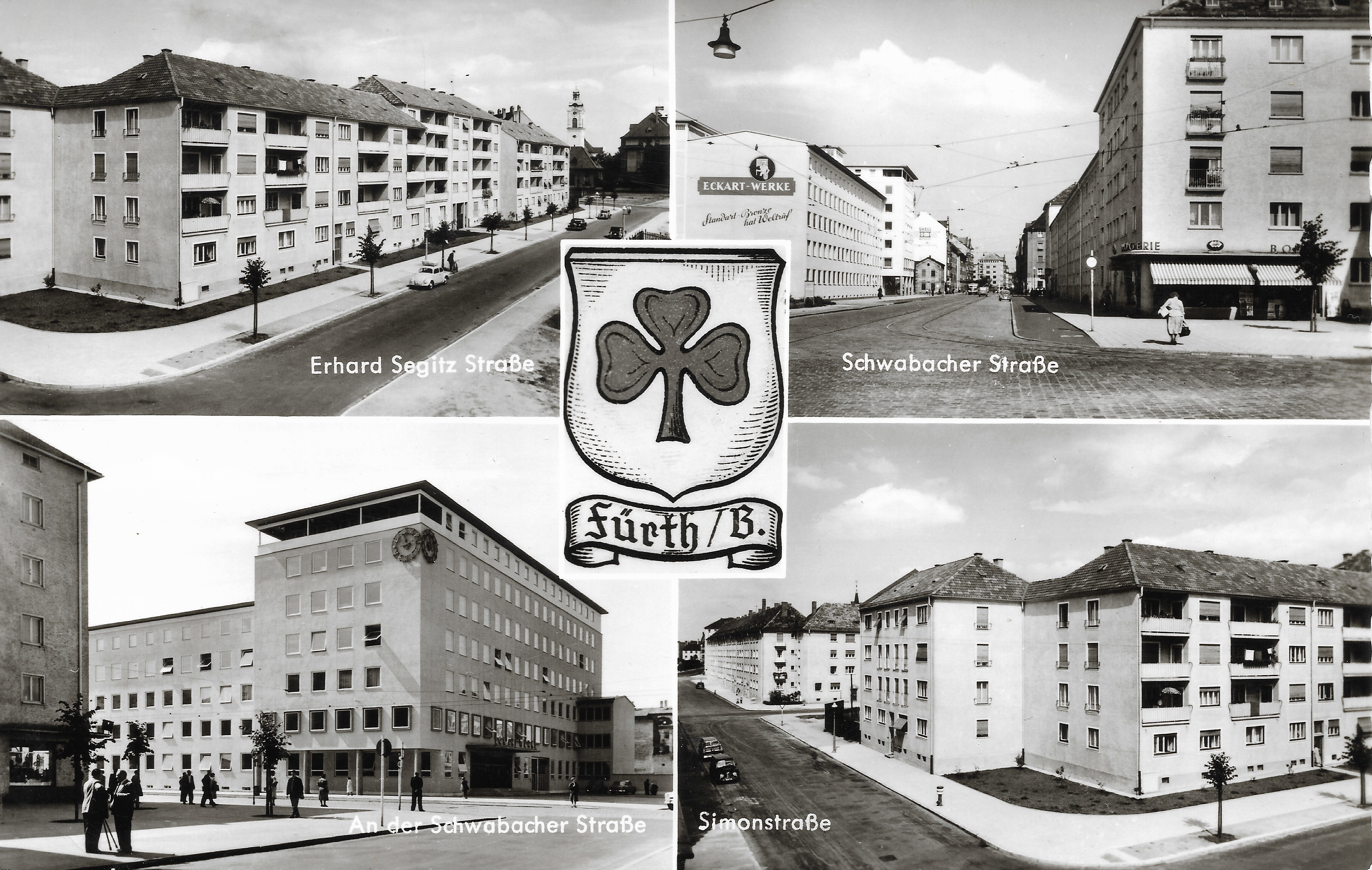 | Beschreibung | Ansichtskarte Schwabacher Straße, Erhard-Segitz-Straße, Simonstraße, 1958 | ||