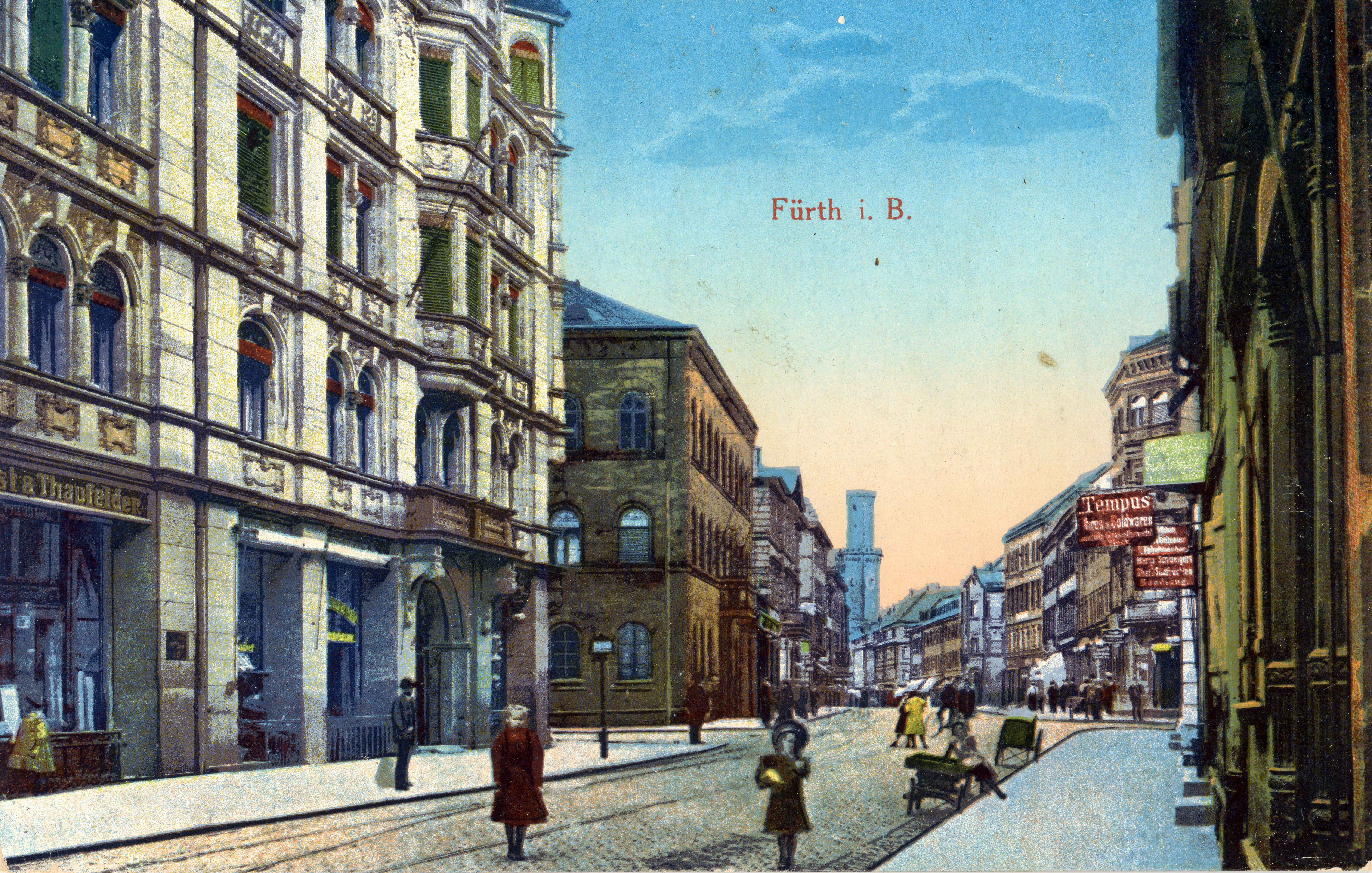 | Beschreibung | Blick in die Schwabacher Straße, im Hintergrund das Rathaus, gel. Juli 1916 | ||