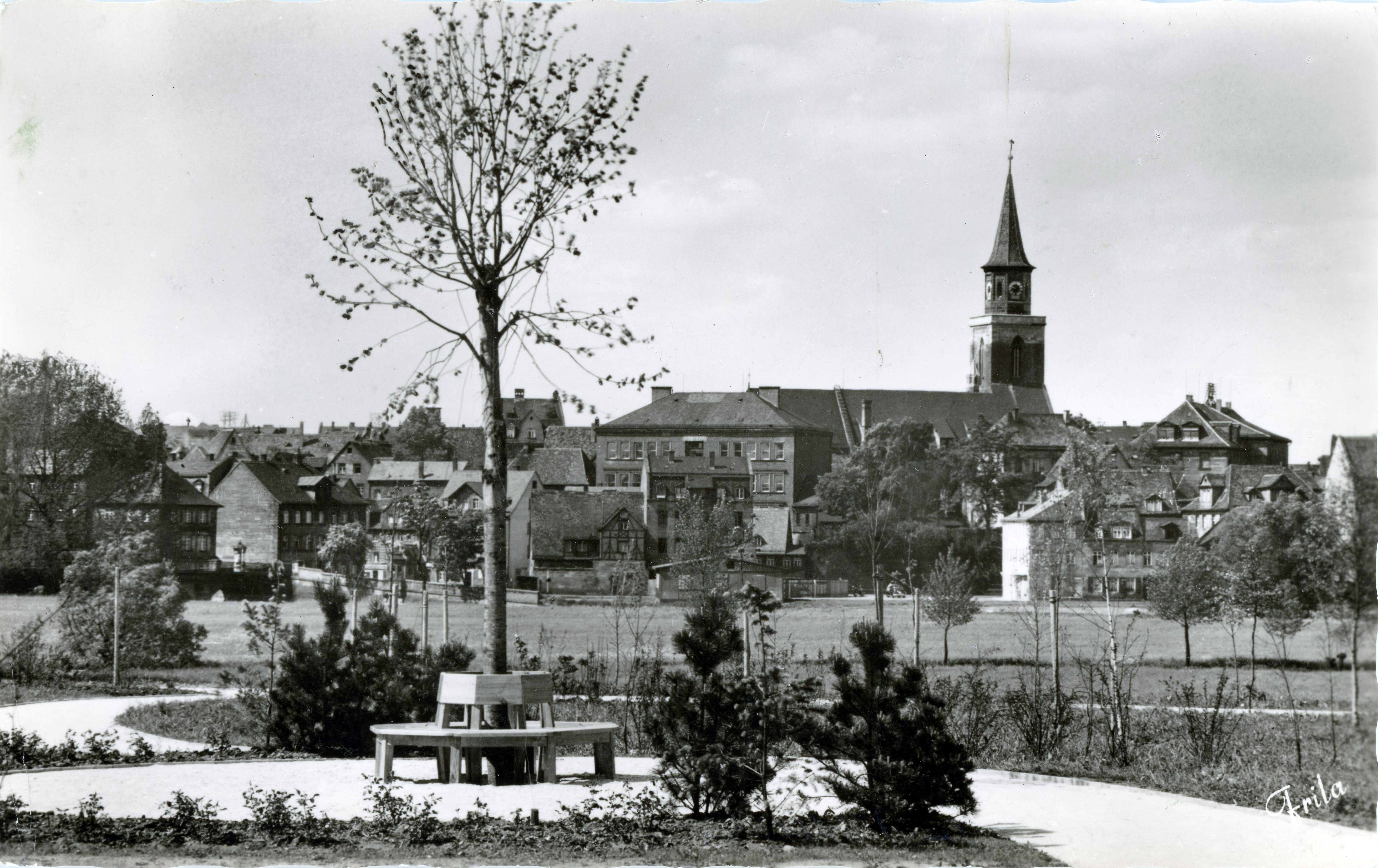 | Beschreibung | Blick über die künftige Nordspange / Kapellenstraße vermutlich vom heutigen Standort des Lindenhain, im Hintergrund die Kirche St. Michael, 1967 | ||