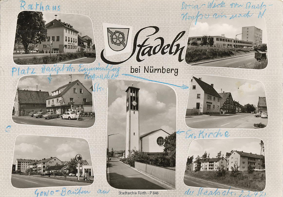 | Dateiinfo (Bild-Unterschrift und Info-Box, automatisch erstellt) | Postkarte von Stadeln bei Nürnberg (sic!), mit handschriftlichem Vermerk: Doria Werke von ... Postkarte von Stadeln bei Nürnberg (sic!), mit handschriftlichem Vermerk: Doria Werke von Staatsstraße aus nach N(orden), Caltex Tankstelle, Gewo Stadeln Wohnblocks, Rathaus Stadeln, ca. 1968<br>Urheber: unbekannt<br>Erstellungsdatum: 1968<br>Lizenz: Bildlizenz-Stadtarchiv | ||