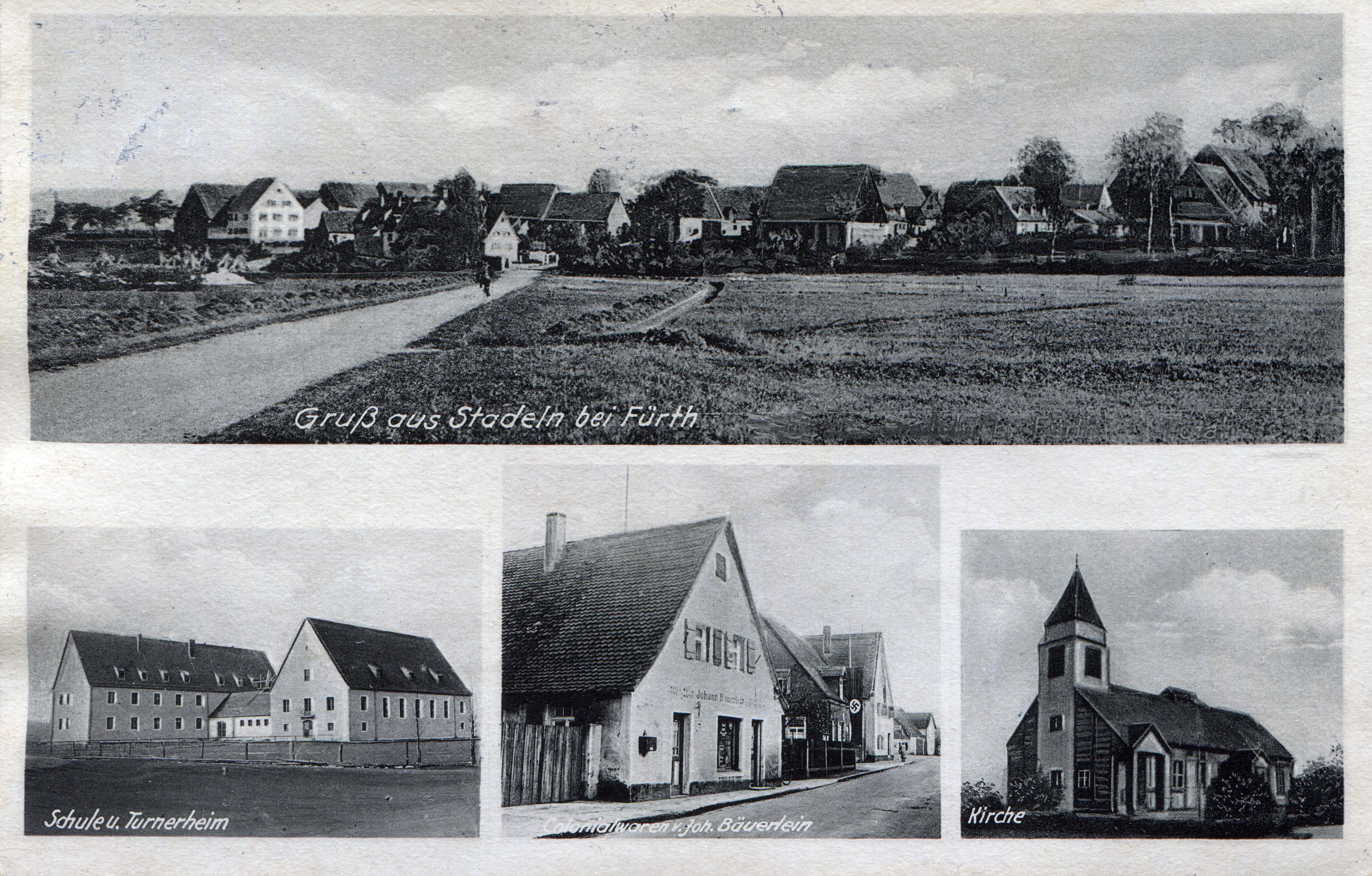 | Beschreibung | Ansichtskarte aus Stadeln mit dem Blick auf den Fischerberg, dem Colonialwarenladen Johann Bäuerlein und der ehemaligen Schule, Gemeinschaftsschule Stadeln, mit Turnhalle, gel. 1940 | ||