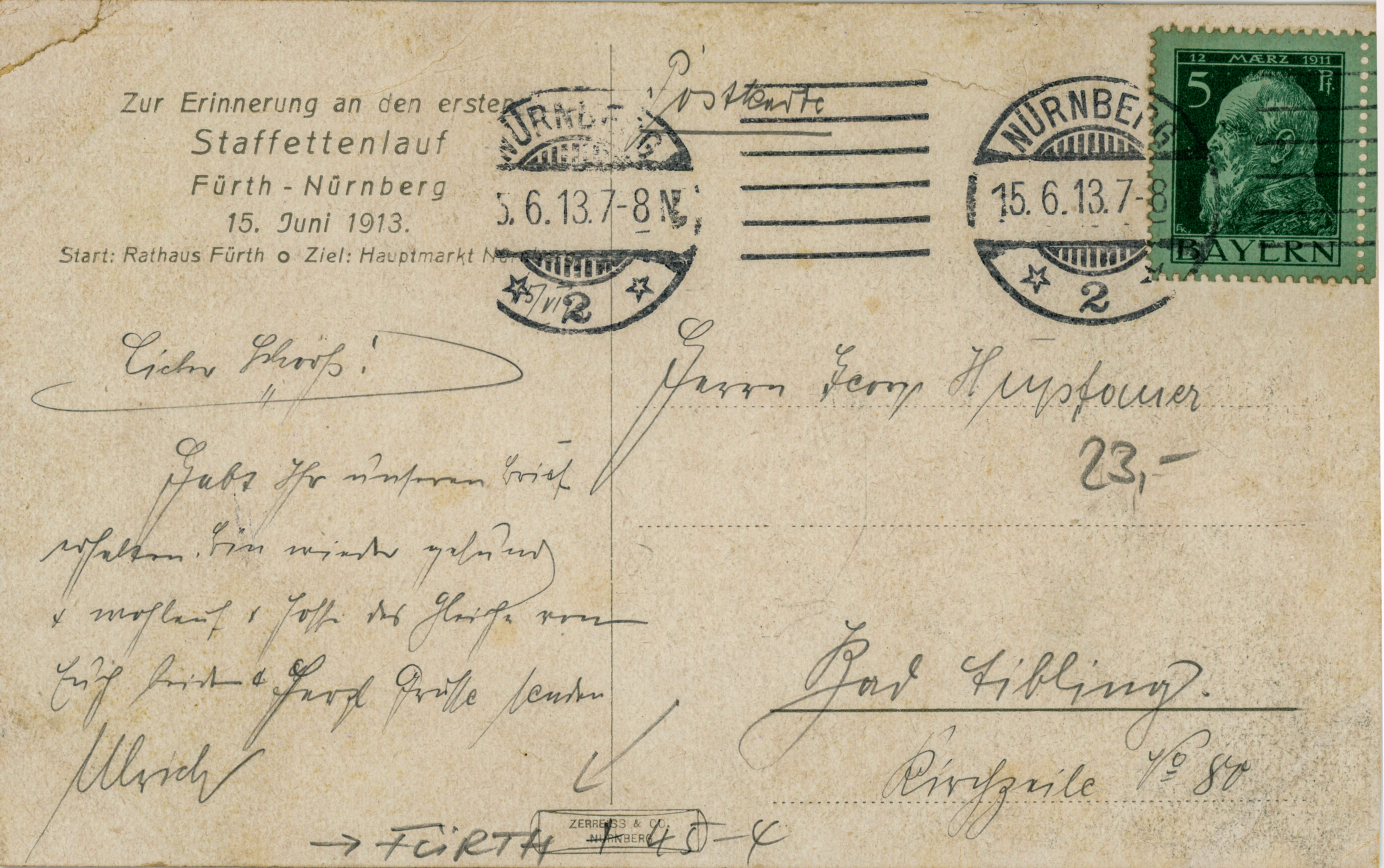 | Beschreibung | Rückseite der Ansichtskarte anlässlich des 1. Staffettenlaufs zwischen Fürth und Nürnberg am 15. Juni 1913 | ||