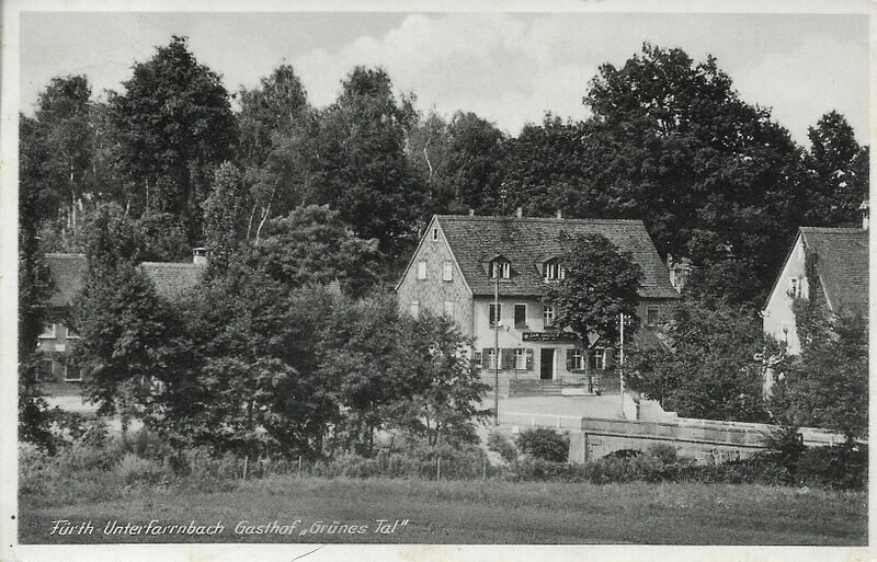 Historische Ansichtskarte: Fürth-Unterfarrnbach Gasthof "Grünes Tal", gel. 1940. Urheber: Ludwig Riffelmacher<br>Erstellungsdatum: 1940<br>Über Datum: 1940<br>Lizenz: cc-by-sa-3.0