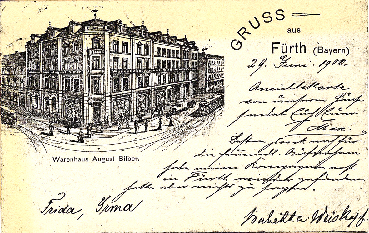 | Dateiinfo (Bild-Unterschrift und Info-Box, automatisch erstellt) | Warenhaus August Silber in der Schwabacher Straße 19, 1902 Urheber: unbekannt<br>Erstellungsdatum: 1902<br>Lizenz: cc-by-sa-3.0 | ||