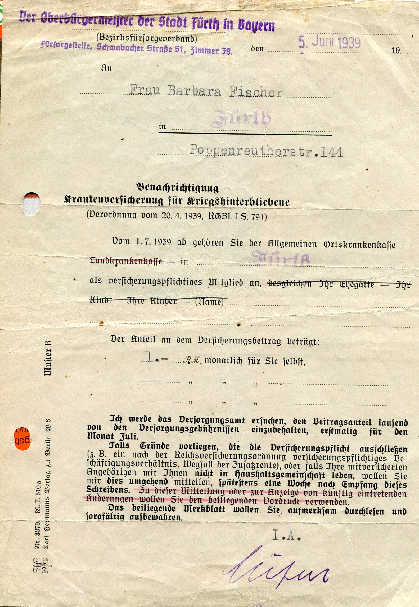 | Beschreibung | AOK Mitgliedsbescheid von 1939 "Benachrichtigung Krankenversicherung für Kriegshinterbliebene" des 1. Weltkriegs für die Witwe der Stadt Fürth Fürsorgestelle | ||