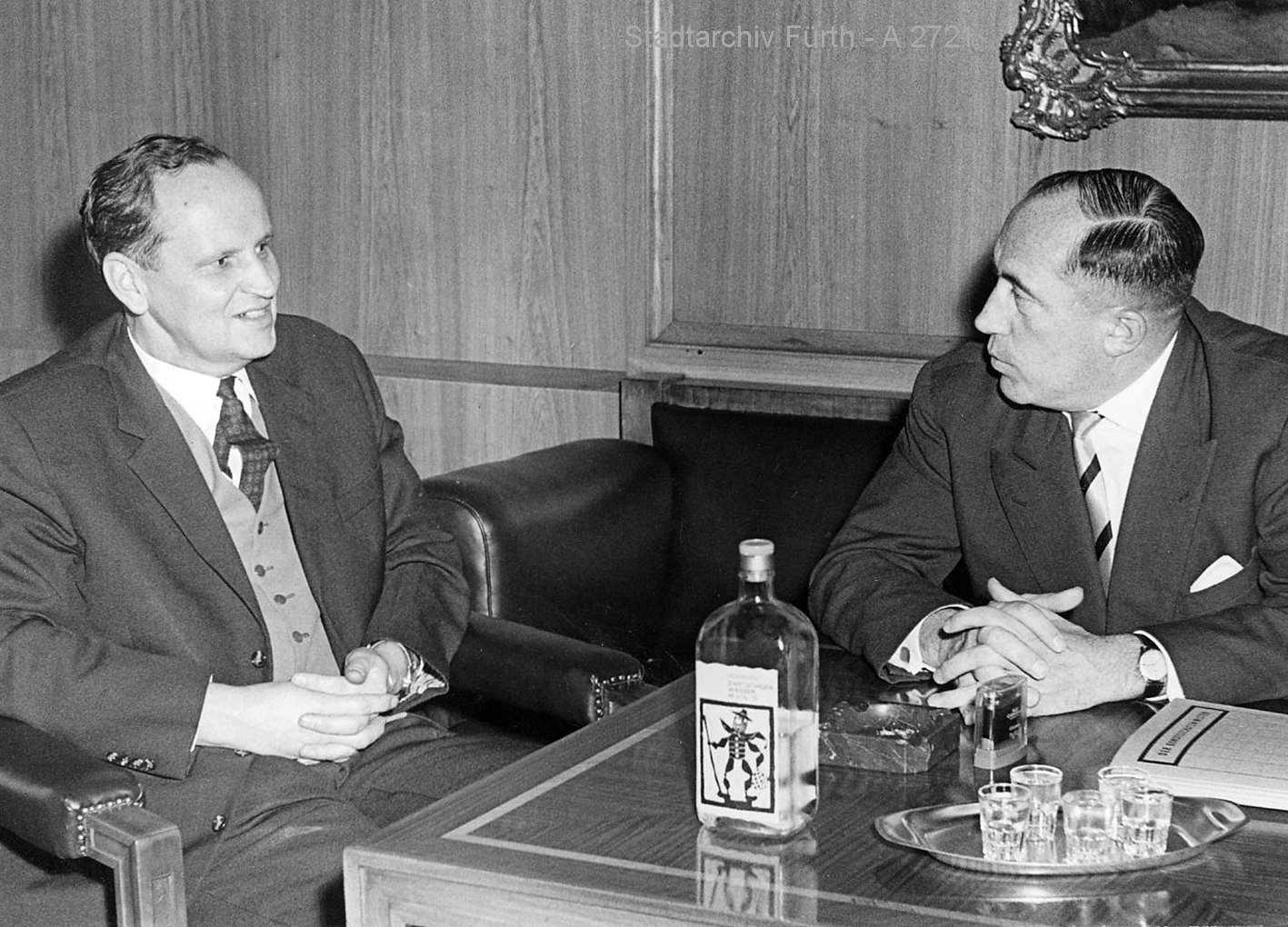 | Beschreibung | Oberbürgermeister Kurt Scherzer mit Werner Dollinger (MdB) im Rathaus vor einem Zwetschgenmännla der Brauerei Humbser, 1966 | ||