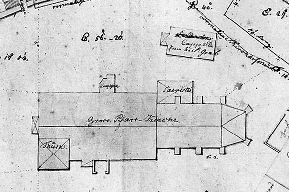 | Beschreibung | Lageplan der Michaeliskirche und der ehem. Heilig-Grab-Kapelle rechts oberhalb der Kirche, Plan von 1812 d.h. kurz vor dem Abriss (Ausschnitt, N bei Gradmaß 330°) | ||