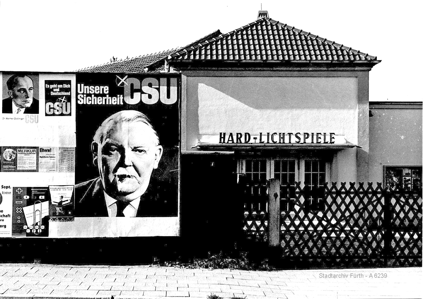 | Beschreibung | Wahlkampfplakate in der Hardstraße vor den Hard-Lichtspielen mit Erhard und Dollinger,1965 | ||