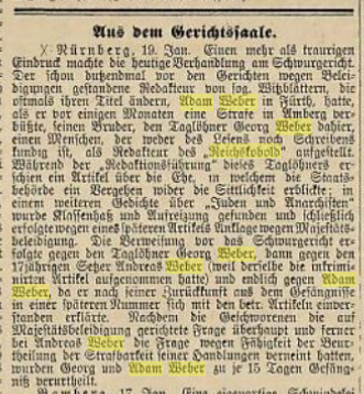 | Beschreibung | Adam Weber erhält 15 Tage Gefängnis; Augsburger Abendzeitung 21. Januar 1885 | ||