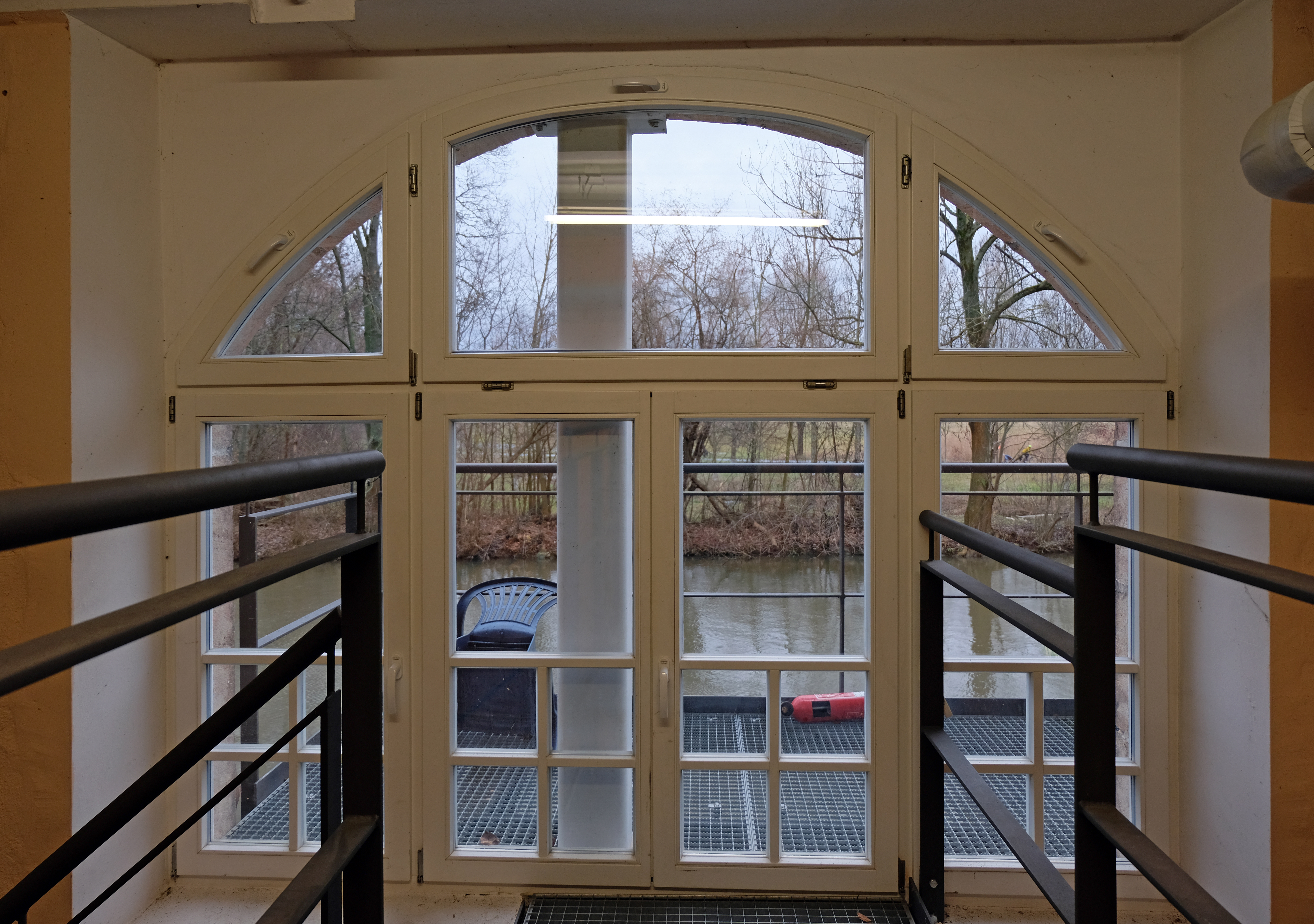 BeschreibungAlte Feuerwache im Eichamt-Untergeschoss - Blick in Richtung Osten - im Hintergrund die am Gebäude direkt vorbei fließende Pegnitz, Jan. 2019