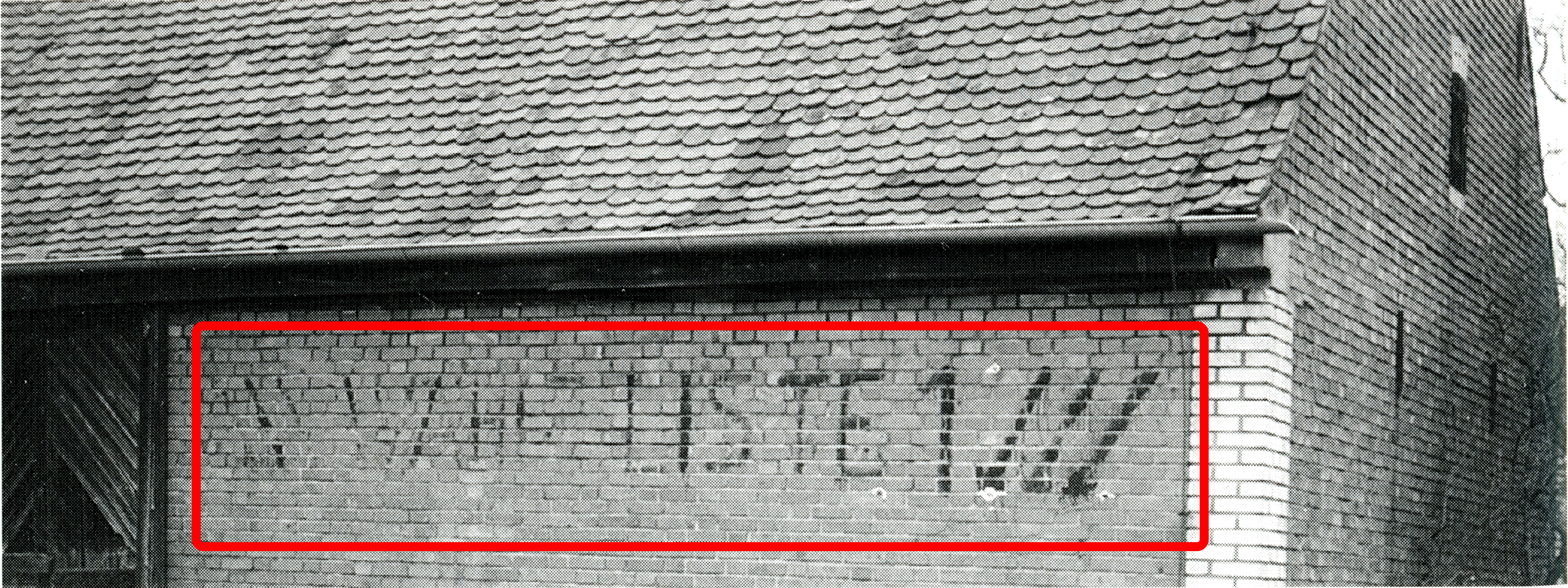 | Beschreibung | Alte Aufnahme der Feldscheune am Kieselbühl in Unterfarrnbach mit noch besser erkennbarer Schrift der ehem. Wahlkampfparole, vermutlich aus dem Jahr 1932 | ||