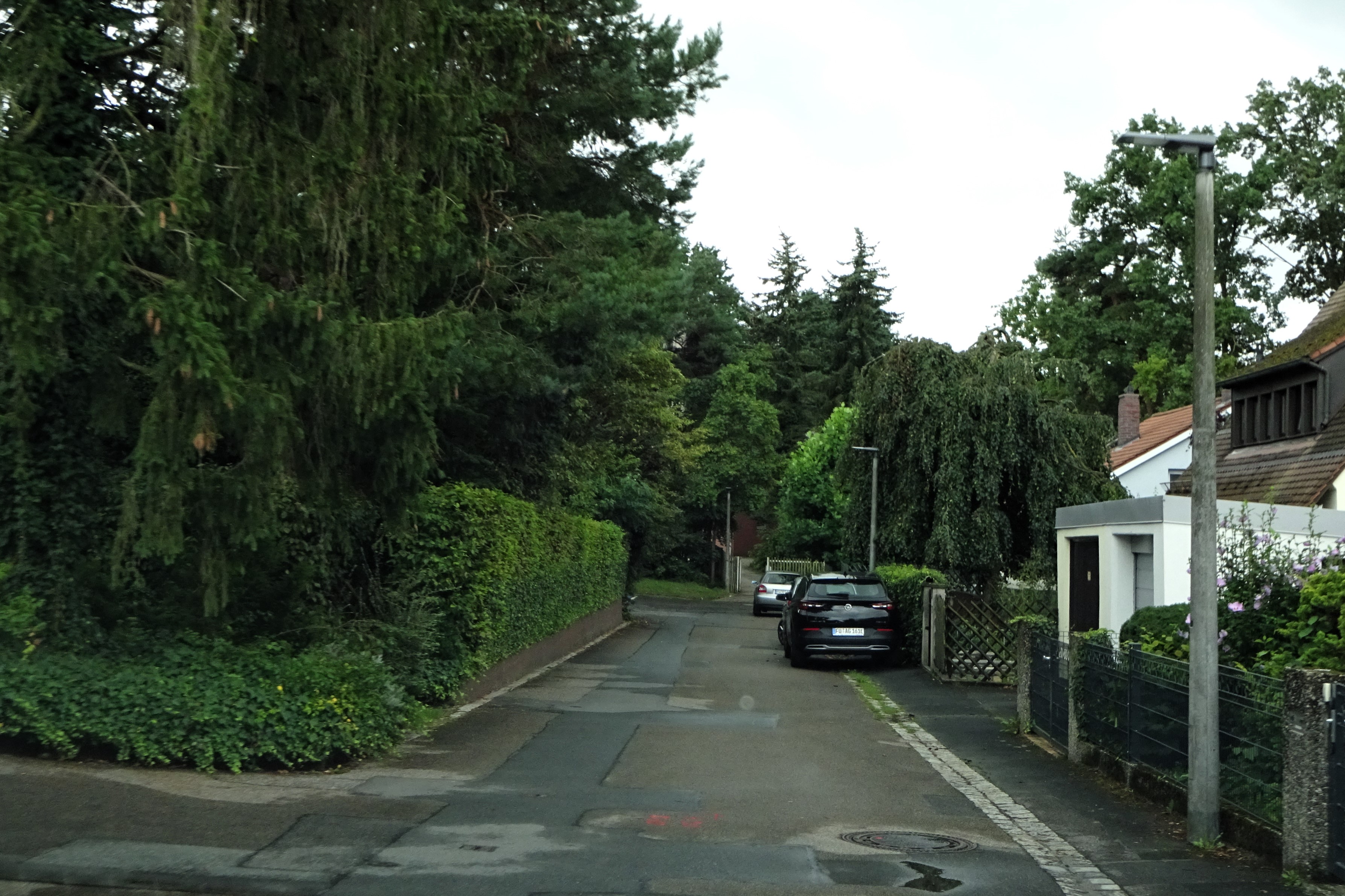 | Beschreibung | Blick in die Straße Am Regnitzhang Richtung Friedhof Stadeln, 2023 | ||