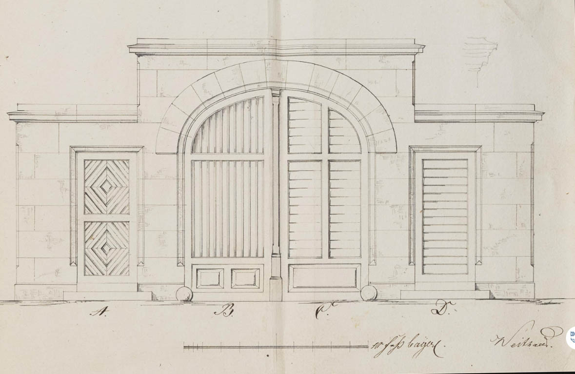 | Dateiinfo (Bild-Unterschrift und Info-Box, automatisch erstellt) | Planzeichnung für neue Tore am Schulhof, Joh. Weithaas Erstellungsdatum: 1852<br>Lizenz: cc-by-sa-3.0 | ||