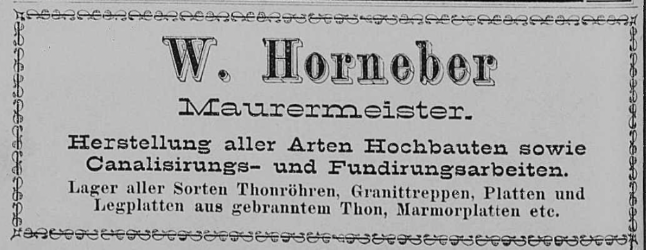 | Beschreibung | Geschäftsanzeige von Maurermeister W. Horneber im Adressbuch 1884 | ||