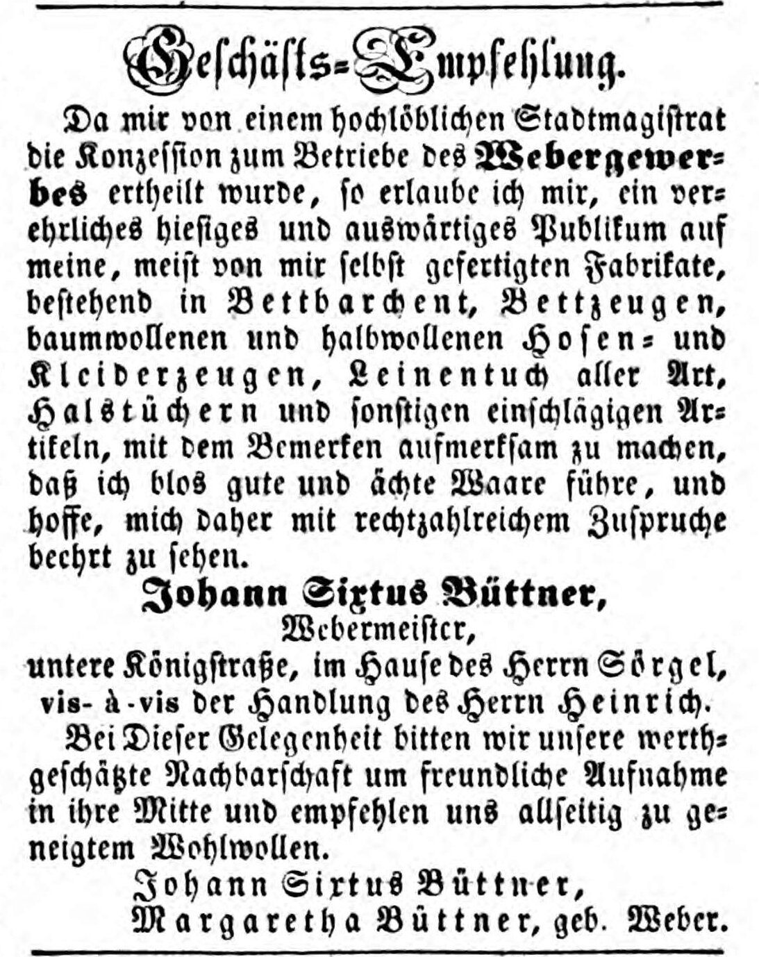 | Beschreibung | Anzeige Johann Sixtus Büttner, Fürther Tagblatt 25.9.1853 | ||