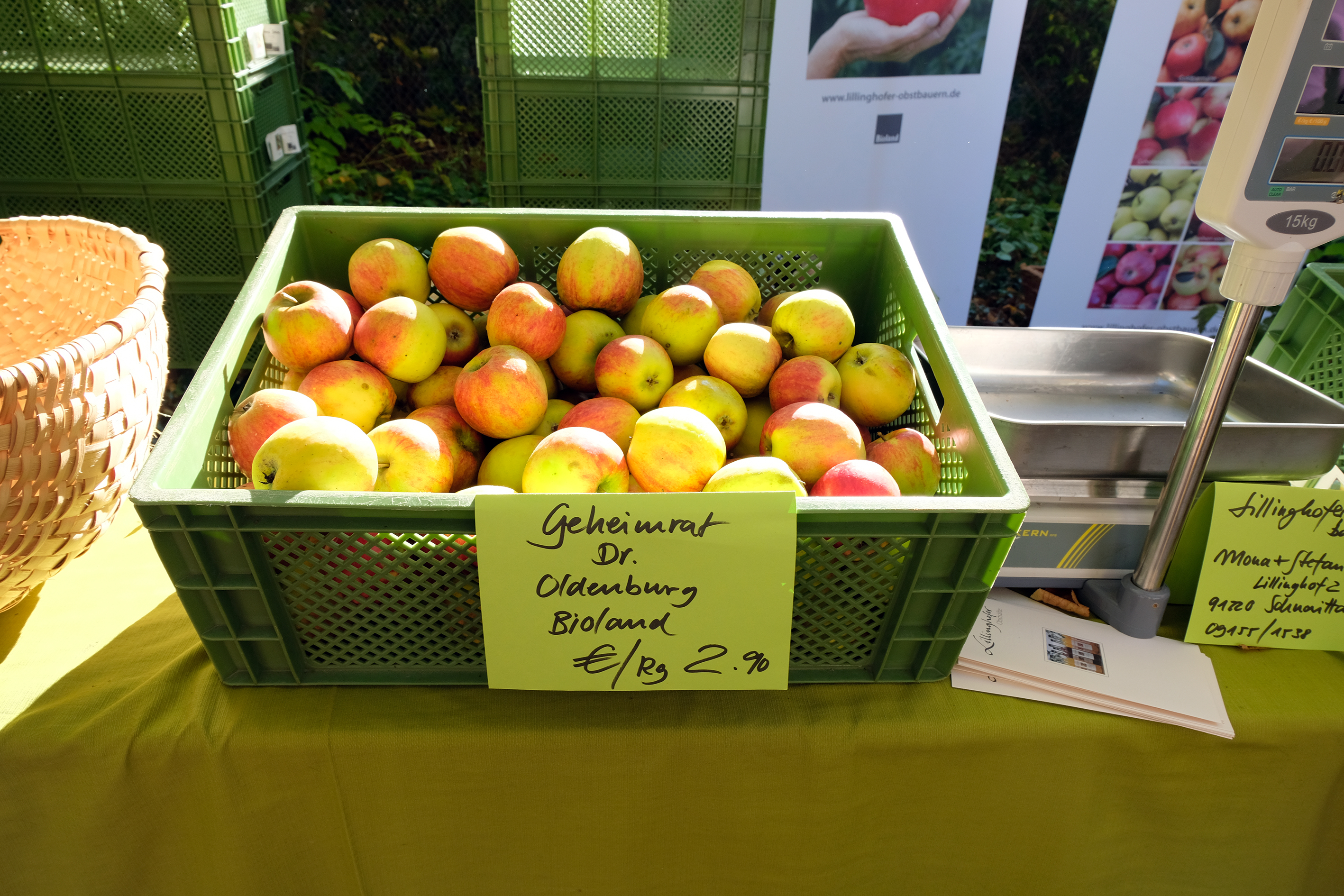 | Beschreibung | Apfelsorte "Geheimrat Dr. Oldenburg" am Fürther Apfelmarkt im Stadtpark, 2017 | ||